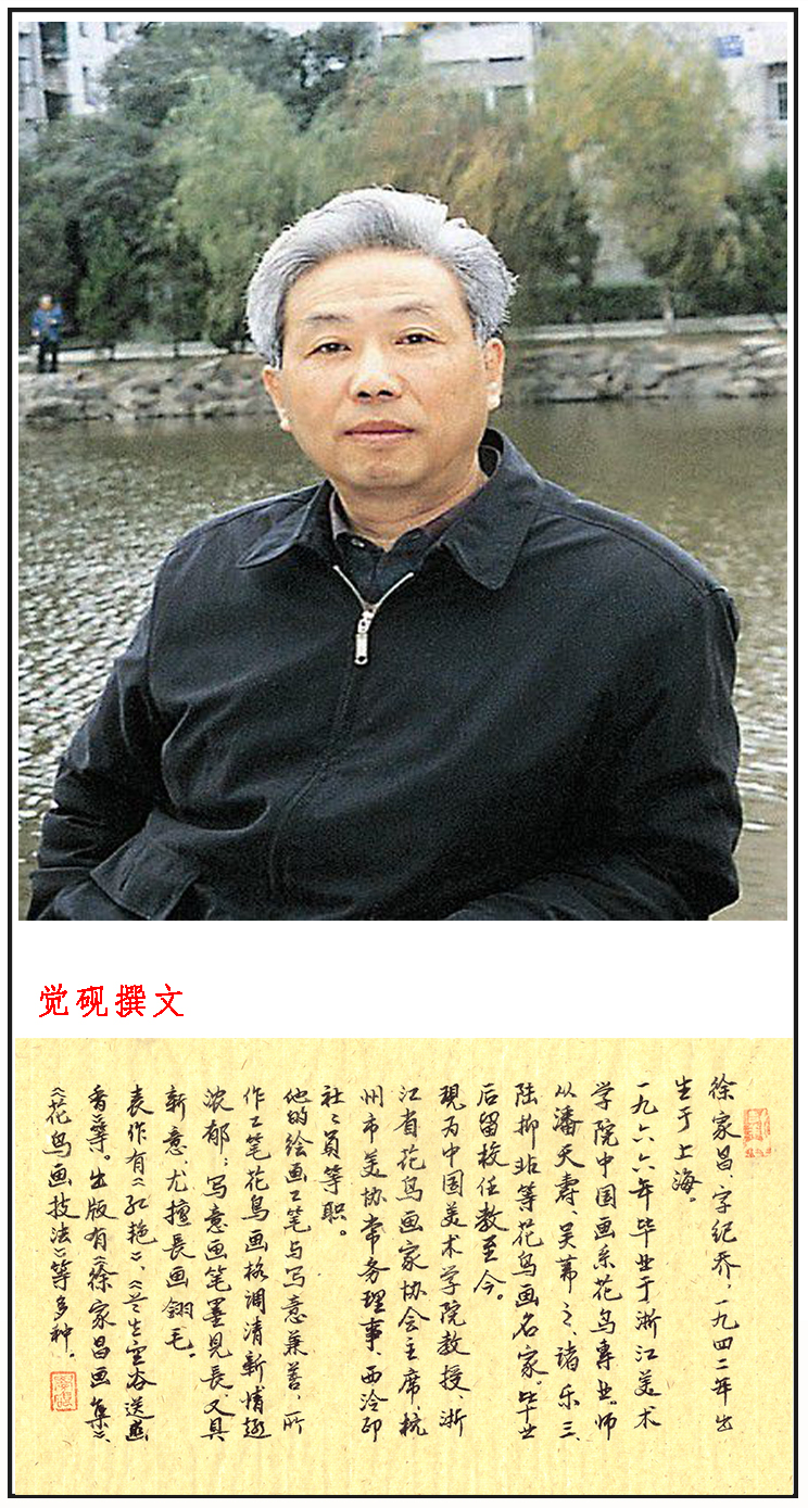 徐家昌,字纪乔,1942年出生于上海。1966年毕业于浙江美术学院中国画系花鸟专业,师从潘天寿、吴茀之、诸乐三、陆抑非等花鸟画名家。1980年该校花鸟画研究生班毕业后留校任教至今。作品具有较为深厚的传统功力,工笔与写意兼善,工笔画方面,对宋元名画颇多研习揣摩,并能融传统技法于生活之中,所作工笔花鸟画格调清新,情趣浓郁;写意画从新罗、南田入手,对陈白阳、周之冕、林以善及至扬州八怪、赵之谦、吴昌硕等大师作品均能心摹手追,穷研不倦,故作品既以笔墨见长,又颇具新意,画翎毛尤为擅长。