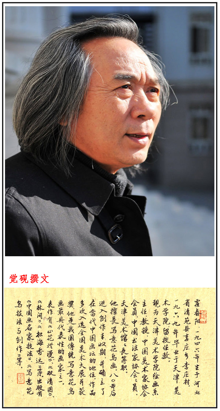 霍春阳。1946年出生于河北省清苑县李庄乡李庄村,1969年毕业于天津美术学院并留校任教至今。历任天津美术学院中国画系系主任、教授、硕士研究生导师。现任天津美术学院美术馆馆长、天津美术家协会副主席、中国美术家协会会员、中国书法家协会会员、美国内森大学特聘教授、博士生导师、大中华学区专家委员会委员、天津画院院外画师、天津青年美协顾问、荣获天津高校名师称号。现任清华大学美术学院、天津音乐学院、山西师范大学、山西大学、烟台大学等高校客座教授、担任北京大学国学社专家顾问。天津市第九届、第十届政协委员。