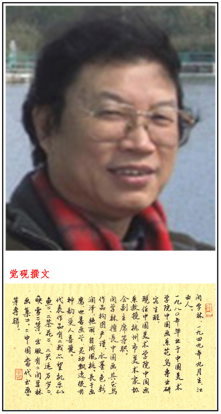 闵学林 (1946.9—)江西人,擅长中国画。中国美术学院中国画系教授。作品《我亦望机乐似鱼》入选全国首届中国花鸟画展;《茶花》入选全国第八届美展。出版有《闵学林画集》、《中国当代书画》等专辑。1980年毕业于中国美术学院中国画系花鸟专业研究生班。中国美术学院中国画系教授。作品《我亦望机乐似鱼》入选全国首届中国花鸟画展;《茶花》入选全国第八届美展。出版有《闵学林画集》、《中国当代书画》等专辑。