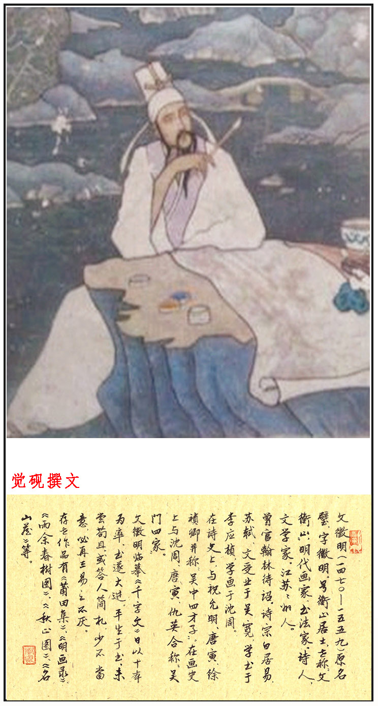 文征明(1470-1559),原名壁,字征明。汉族,长州(今江苏苏州)人。少拙于书,刻意临学,亦规模宋、元,既悟笔意,遂悉弃去,专法晋、唐。著莆田集。四十二岁起以字行,更字征仲。因先世衡山人,故号衡山居士,世称“文衡山”,明代画家、书法家、文学家,曾官翰林待诏。诗宗白居易、苏轼,文受业于吴宽,学书于李应祯,学画于沈周。在诗文上,与祝允明、唐寅、徐真卿并称“吴中四才子”。在画史上与沈周、唐寅、仇英合称“吴门四家”。
