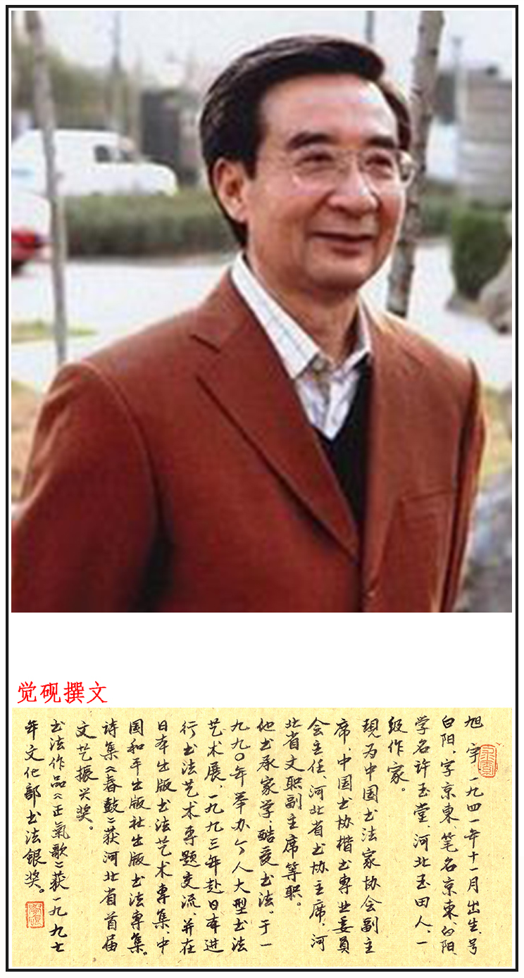 旭宇,1960年6月入党,1960年7月参加工作,毕业于河北大学教育系,大学学历,编审,一级作家。1960年7月在河北省玉田师范任教,1964年9月就读于河北大学教育系,1968年11月在解放军某部工厂劳动锻炼,1970年2月任内蒙古建设兵团报社记者、编辑,1976年3月任河北省文联秘书,1979年4月任河北省文联《长城》杂志社编辑组长,1981年参加河北省书法家协会的创建工作,1983年11月任河北省文联民间文学研究会主席兼秘书长,1987年5月任河北省文联《诗神》杂志社主编,1996年10月任河北省文联副主席,1997年11月任河北省文联副主席、省书协主席兼秘书长,2000年至2010年12月任河北省文联副主席、省书协主席、中国书协第四、五届副主席。