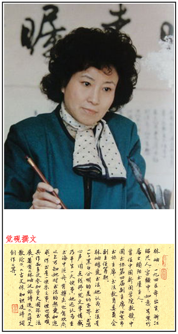 林岫(1945-)女,字频中、如意,号紫竹居士、颐阳书屋主人。浙江绍兴人。汉族,著名诗人、书法家。现任中国书法家协会副主席,北京书法家协会主席。1967年毕业于南开大学中文系,大学学历,教授。1987年4月入党。1962年9月就读于南开大学中文系,1967年毕业于南开大学中文系。1968年7月任大兴安岭林业局干部,1976年6月任原兵器工业部《科技情报》副主编,1988年5月任中国新闻学院古典文学副教授、教授,2000年12月任中国新闻学院教授、中国书协第四届副主席,2004年任中国新闻学院教授,北京市书协主席,中国书协第五届副主席,中国国际艺术家研究院艺术顾问,书法教育委员会副主任,中华炎黄文化研究会理事,北京大学中日诗歌比较研究会副会长,艺术品中国网资深艺术顾问、2009年任中国楹联出版社《百家联稿》丛书编委会顾问等。