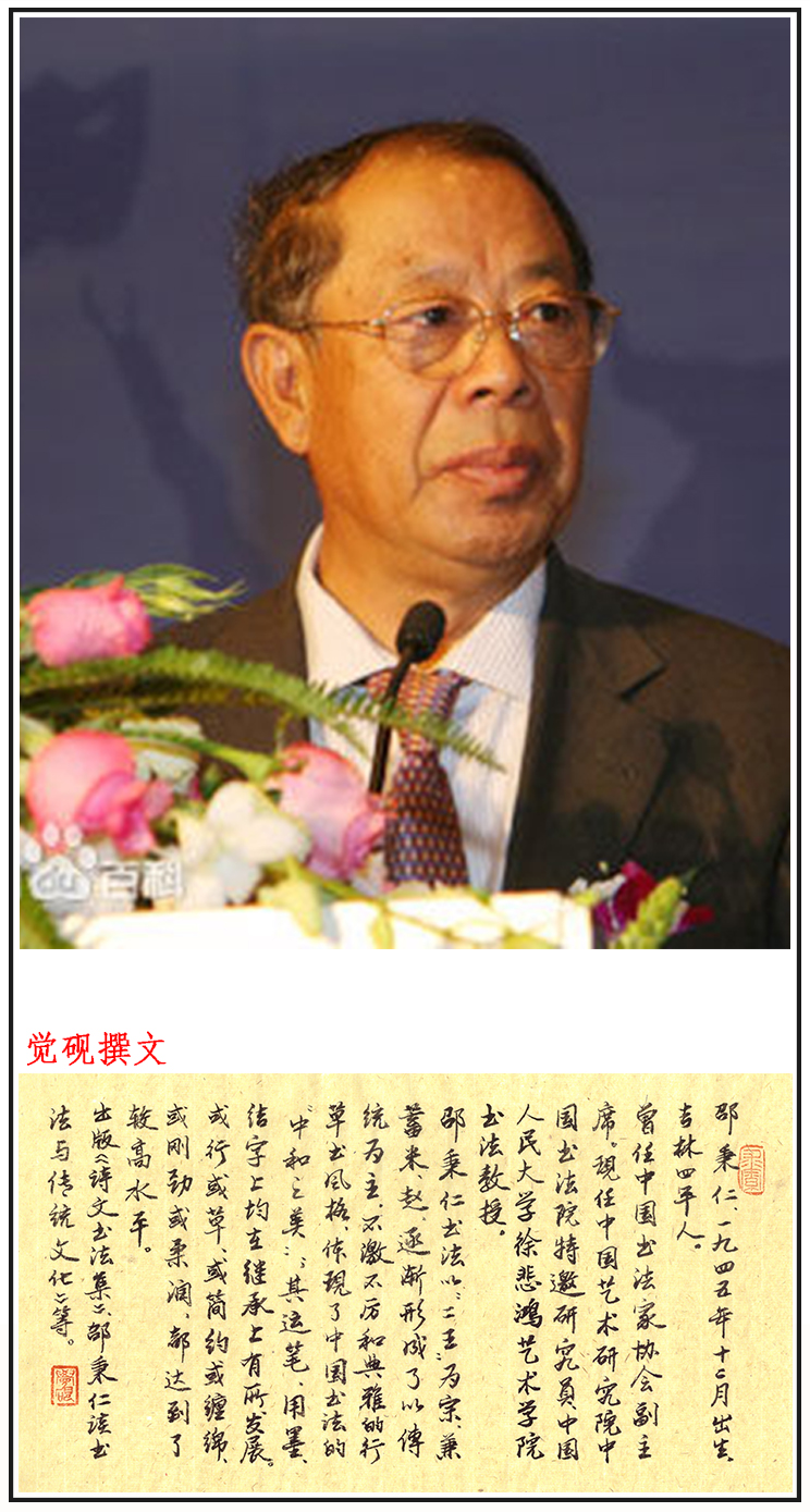 邵秉仁,男,汉族,生于 1945 年 12 月,吉林四平人, 曾任中国书法家协会副主席,在2010年12月29日闭幕的中国书法家协会第六次全国代表大会上,被聘为中国书法家协会顾问,并获得对书法事业发展有重要贡献的书法家荣誉称号。现任全国政协人口资源环境委员会副主任,中国艺术研究院中国书法院特邀研究员,中国人民大学徐悲鸿艺术学院书法教授。