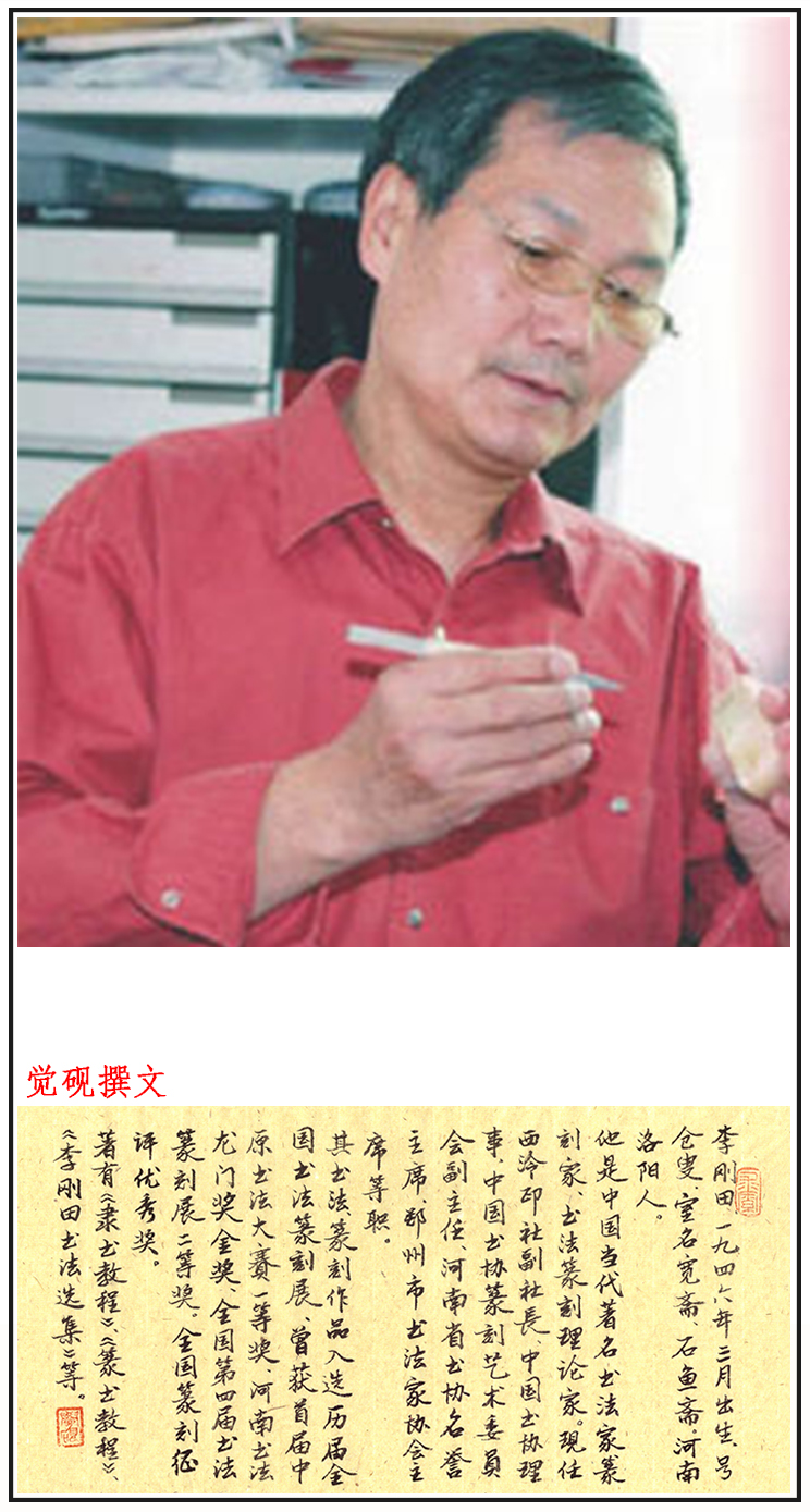 李刚田,男,汉族,1946年3月生,河南洛阳人。号仓叟,室名宽斋、石鱼斋。中国当代著名书法家、篆刻家、书法篆刻理论家。现任中国书法家协会理事、中国书协篆刻艺术委员会副主任、西泠印社副社长、中国国家画院院委、中国艺术研究院篆刻院研究员、河南省书法家协会名誉主席、郑州市书法家协会主席。曾任《中国书法》杂志主编。