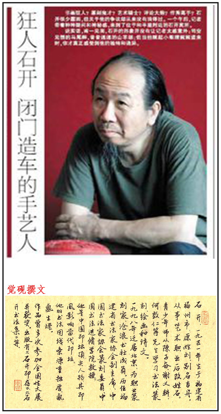 石开,1951年生于福建省福州市,原姓刘,别名吉舟,从事艺术职业后改姓石。青少年师从陈子奋、谢义耕、何敦仁等先生学习书法、篆刻、绘画、诗文。1998年迁居北京,为职业篆刻书法家,沧浪书社成员。历任福建省书法家协会副主席、中国书法家协会篆刻委员、中国书法进修学院教授。