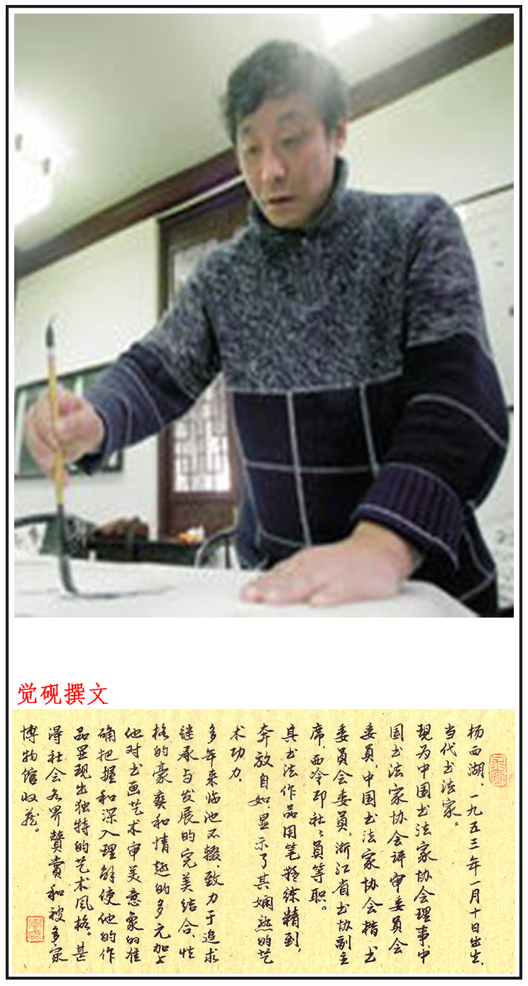 杨西湖,男,汉族,当代书法家。1953年1月10日出生,无党派人士。副研究馆员。现为中国书法家协会理事,中国书法家协会评审委员会委员,浙江省书法家协会顾问。作品入全国第二、三、七、八届书法篆刻展,全国第五届中青年书法篆刻展。获全国第五届中青年书法篆刻展优秀作品奖。