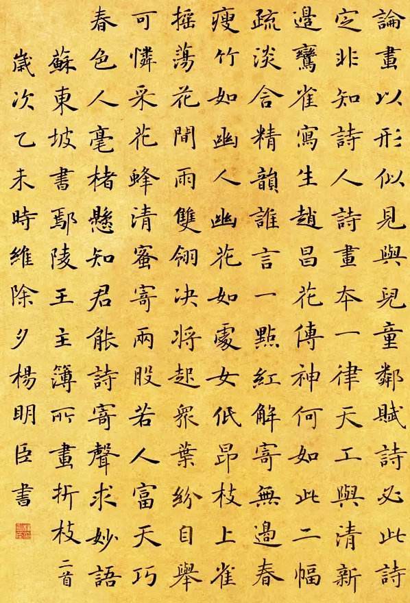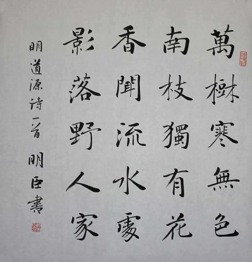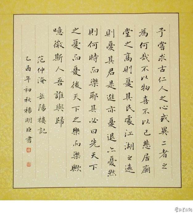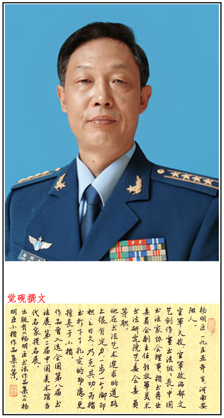 杨明臣,1955年生,河南安阳人 ,空军大校,空军政治部文艺创作室书法组组长,中国书法家协会理事,楷书专业委员会副主任,解放军美术书法研究院艺委会委员。