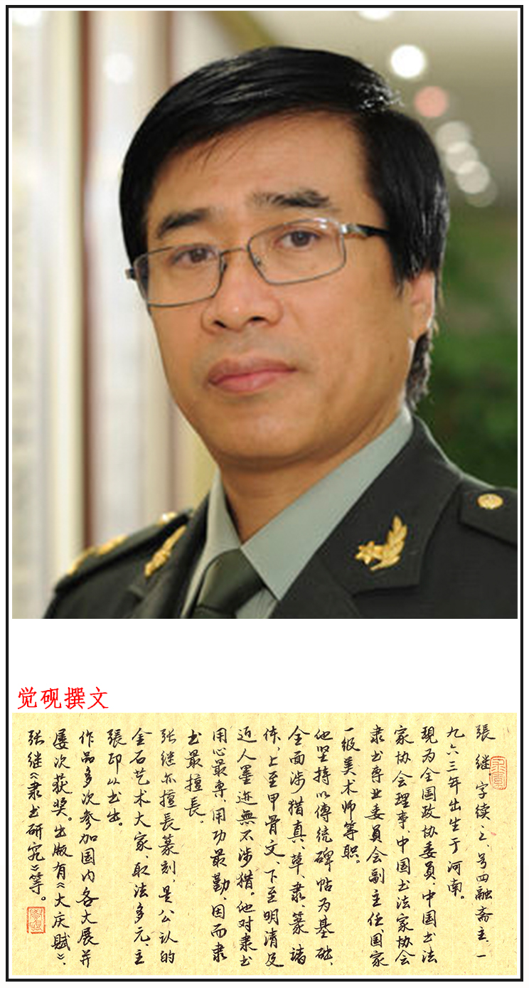 张继,字续之,号四融斋主,一九六三年出生于河南。现为全国政协委员、中国书法家协会理事、中国书法家协会隶书专业委员会副主任、中华诗词学会理事、国家一级美术师、中国人民革命军事博物馆美术书法创作中心副主任兼秘书长等。