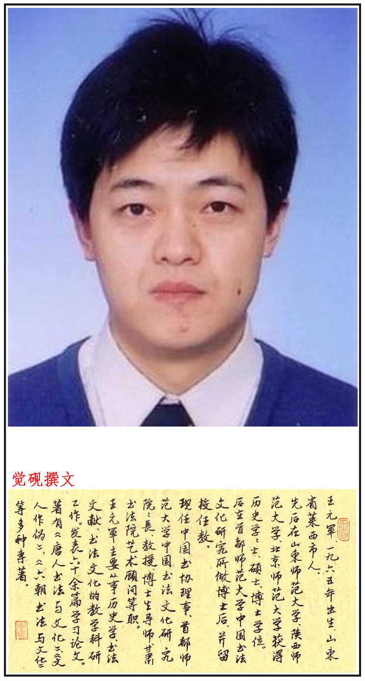 王元军,男,1965年出生于山东省莱西市。中国第一位书法博士后。现为首都师范大学中国书法文化研究院副院长、教授、博士生导师、中国书法家协会理事。发表历史学、书学学术论文60余篇。出版《唐人书法与文化》、《六朝书法与文化》《汉代书刻文化研究》等专著7部。承担有国家社科基金艺术项目等课题。