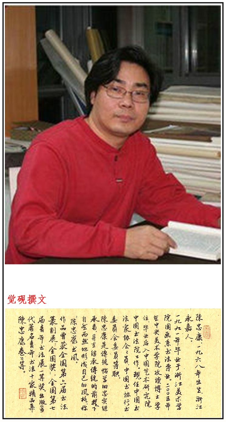 陈忠康,1968年生,浙江永嘉人。中央美术学院美术学博士,文化部中国艺术研究院中国书法院硕士研究生导师,中国书法家协会会员,中国书法家协会行书委员会委员。1991年毕业于浙江美术学院(现中国美术学院)国画系书法专业,曾任职于温州市博物馆、温州师范学院,曾为浙江省书协创作委员会委员、浙江省青年书协副主席、温州市书法家协会副主席。陈忠康是“二王”一脉在现今书坛的代表人物,风格清畅超妙、风规自远。作为当代传统帖学的忠实传承者,用笔理性,气息舒缓,古意盎然,在广大青年书法爱好者当中曾一度形成了“陈忠康书风”。