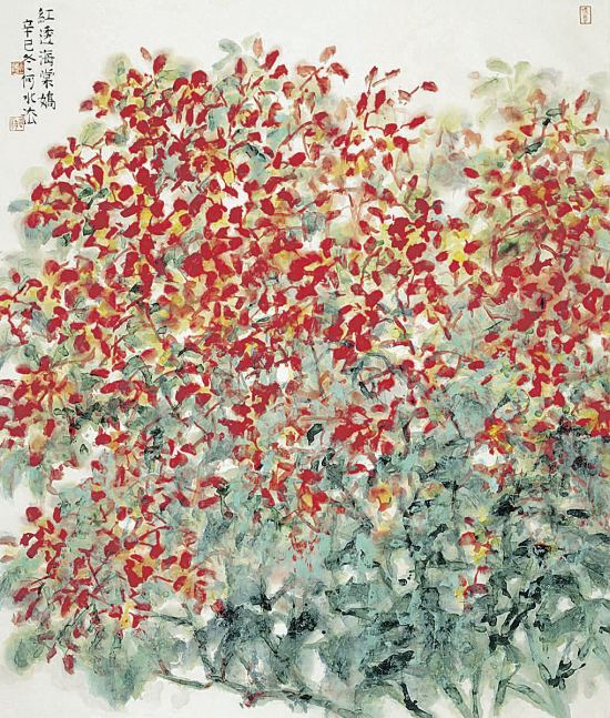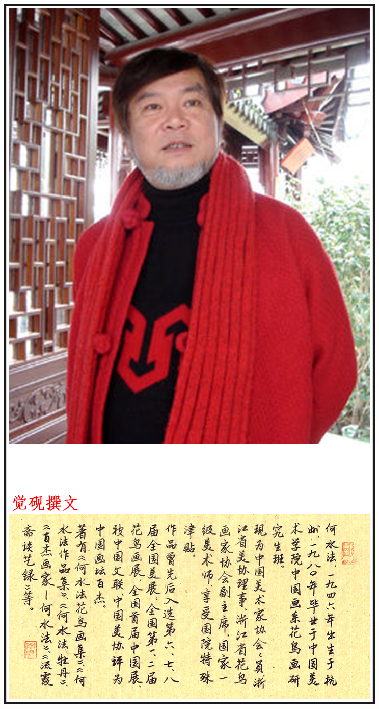 何水法,1946年8月生于杭州,他先后在日本、马来西亚等国家和北京、上海、山东等地举办大型个人画展。出版有《何水法花鸟画集》、《当代最具升值潜力的画家·何水法》等二十余部。何水法曾对两宋的花鸟画作过精深的研究,因此,他的工笔花鸟结构严谨,用笔圆润自如,设色典雅秀逸,写意则受青藤、八大之影响,因而所作写意花鸟气旺神畅,笔墨华滋,浑然天成,厚实灵动,相映成趣。2016全国两会,政协委员何水法提案建议取消中考。