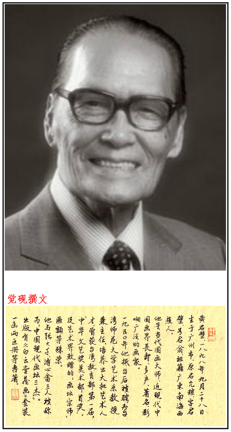 黄君璧(1898—1991),广州南海人。原名允瑄,晚号君翁 [1] ,本名韫之,以号行,中国现代著名国画艺术家、教育家。父仰荀,家藏甚富。早年毕业于广东公学,后从画家李文显游,并与粤东藏家交往。致力于山水画,尤以画云水瀑布为长。1923年与卢振寰、黄般若等成立癸亥合作画社。 [2] 1929年任广州市立美术专科学校教务主任、1937年后历任国立中央大学艺术系教授等。1949年迁居台湾,任今台湾师范大学艺术系教授、主任。多次在国内外举办个人画展。传统功底深厚,经历了现代中国画的继承、演变、革新的过程。出版著作《黄君璧画集》《黄君璧书画集》等。
