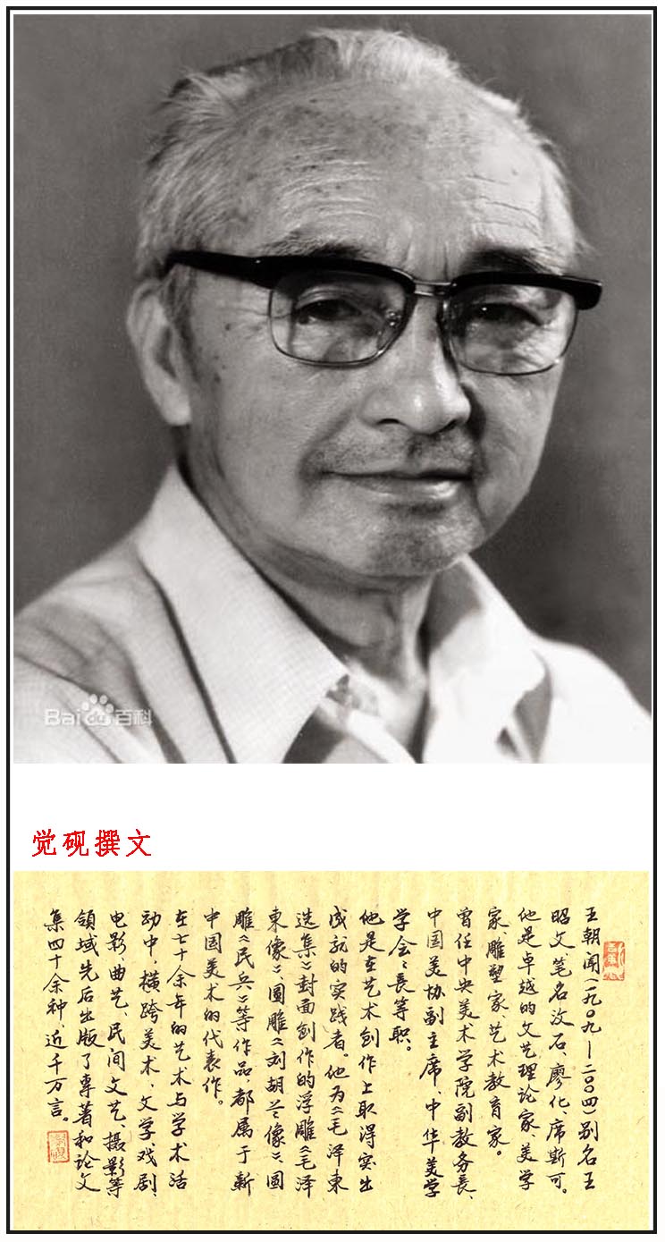 王朝闻,雕塑家、文艺理论家、美学家。王朝闻(1909—2004),别名王昭文,后取《论语·里仁》中“朝闻道,夕死可矣”语义,更名王朝闻。笔名汶石、廖化、席斯珂,卓越的文艺理论家、美学家、雕塑家,艺术教育家,新中国马克思主义文艺理论和美学的开拓者与奠基人之一。王朝闻1909年4月18日生于四川省合江县。早年学习绘画、雕塑。1926年在成都艺专等校学美术,1932年在杭州国立艺专学雕塑。1937年参加浙江抗敌后援会所属的浙江流动剧团和五路军战地服务队,从事抗日文艺宣传活动,同年加入中国共产党。1939年在成都私立南虹艺专等校教书,任成都民众教育馆美术部主任。1940年12月赴延安后,曾在鲁迅艺术文学院美术系任教。1941年为延安中央党校大礼堂创作的大型毛泽东浮雕像,被称为解放区美术作品的代表作。