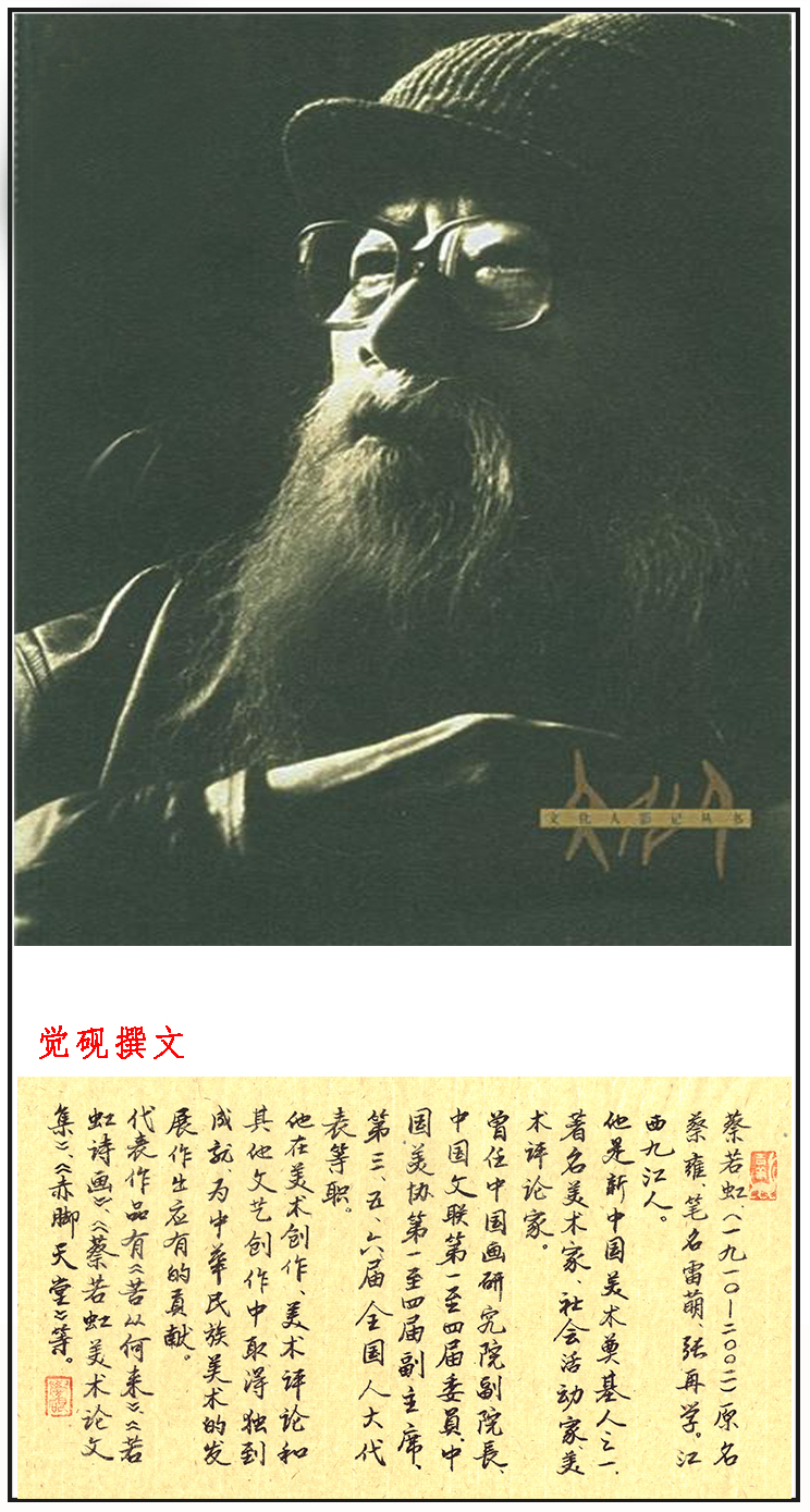 蔡若虹(1910.1.26-2002.5.2)新中国美术奠基人之一、著名美术家、社会活动家。原名蔡雍,笔名雷萌、张再学。画家,美术评论家,江西九江人。在长达几十年的美术创作、研究、教育和领导美术界工作的生涯中,蔡若虹贯彻执行党的文艺路线方针政策,尊重艺术规律,并在美术创作、美术评论和其他文艺创作中取得独到成就。他为中国人民的革命事业,为中华民族美术的发展和社会主义美术事业呕心沥血,尽心尽责。