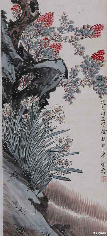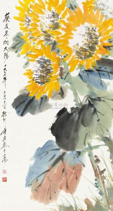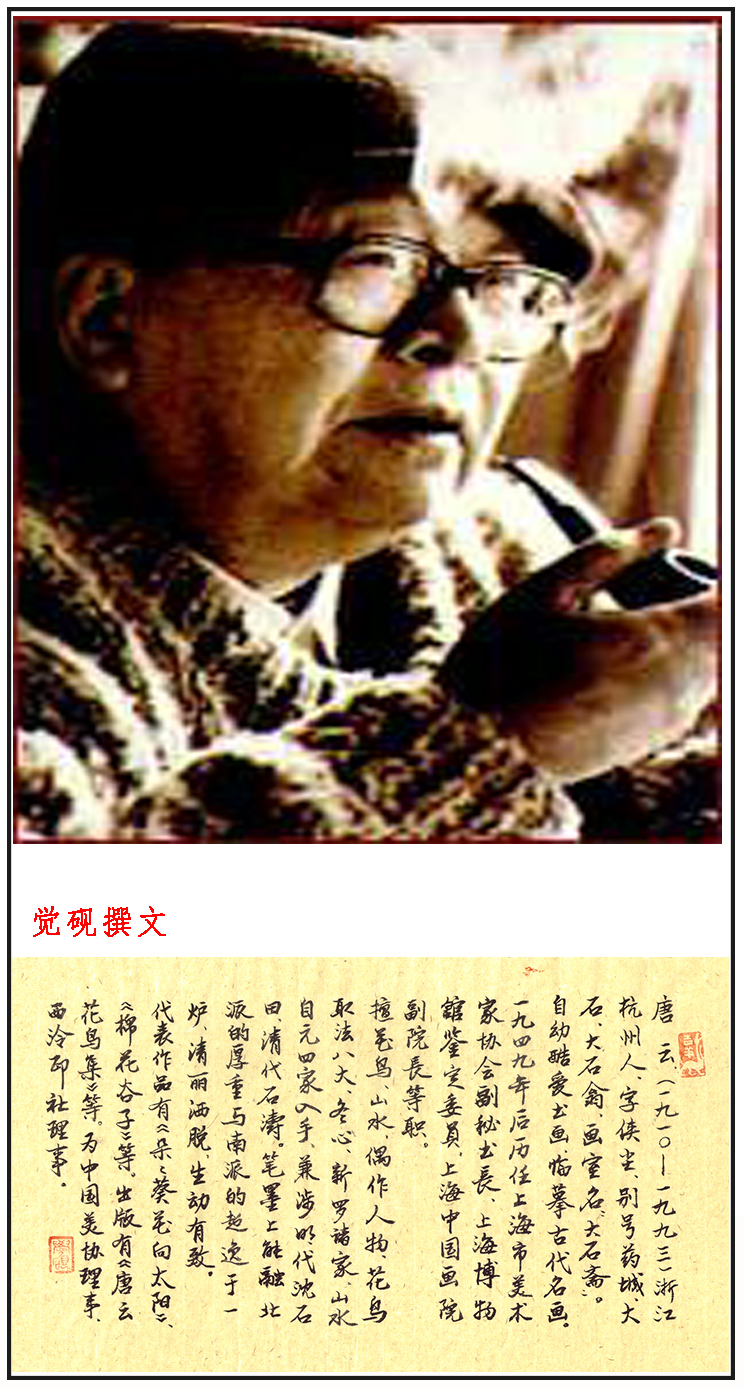 唐云(),字侠尘,别号药城、药尘、药翁、老药、大石、大石翁,画室名“大石斋”、“山雷轩”。生前曾担任中国美术家协会理事,中国美术家协会上海分会副主席,中国画研究院院务委员,上海中国画院副院长、代院长、名誉院长等职。花鸟取法八大、冬心、新罗诸家,山水自元四家入手,兼涉明代沈石田、清代抓住特点大胆落墨,细心收拾,笔墨上能融北派的厚重与南派的超逸于一炉,清丽洒脱,生动有效。作品多次在国内外展出并在报刊上发表。代表作品有《朵朵葵花向太阳》、《棉花谷子》、《红荷》、《鲜花硕果》、《郁金香》、《松鹰》、《竹》、《白荷》、《海棠双鸟》、《山雨欲来》、《咏梅》等。出版《唐云花鸟画集》、《革命纪念地写生选》等多种,亦擅书法,长于早篆及行书,工诗文,精鉴赏。