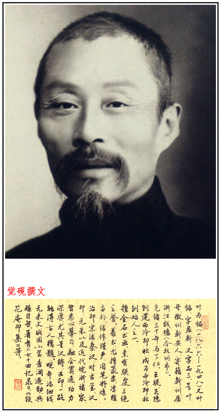 叶为铭,原名铭,安徽歙县人,世居杭州。篆刻师法浙派,宗法秦汉,以平直朴茂为时所重。与丁仁、王裼、厉良玉、吴隐共创西泠印社。著有《广印人传》《金石家传略》《叶氏印谱存目》《歙县金石志》《列仙印玩》等。