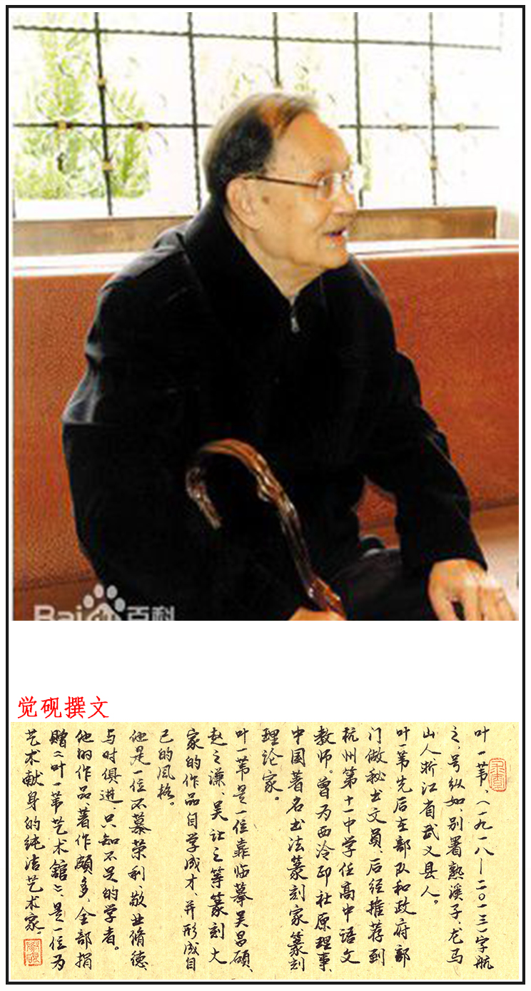 叶一苇(1918.04.13~2013.02.26),男,字航之,号纵如,别署熟溪子、龙马山人,浙江省武义县人,西泠印社原理事,著名书法篆刻家,篆刻理论家,浙江省书法家协会原顾问,浙江省文史研究馆原馆员,浙江省电力书法家协会原顾问,浙江省之江诗社原顾问,杭州市政协诗社原副社长,武义县书法家协会原名誉主席。2001年被浙江省人民政府授予“有突出贡献的老文艺家”金质奖章。2013年2月26日,叶一苇同志在家乡浙江武义病逝,享年96岁。