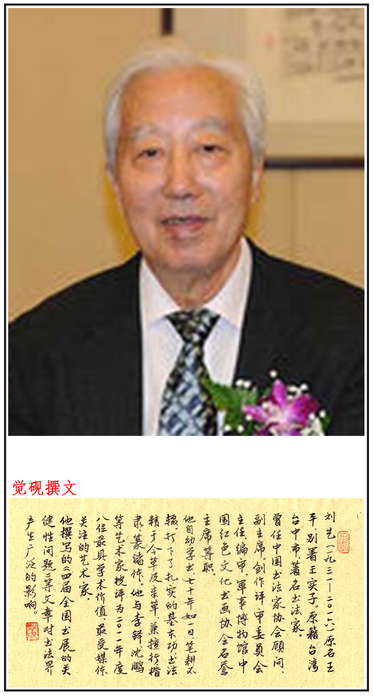 刘艺,原名王平,别署王实子。著名书法大家。(1931年(辛未年)1月25日生-2016年12月25日) [1] ,原籍台湾台中市。曾任中国书法家协会副主席、创作评审委员会主任、编审。现为中国书法家协会顾问,军事博物馆中国红色文化书画协会名誉主席等职,享受国务院特殊津贴。