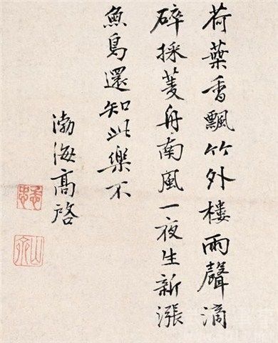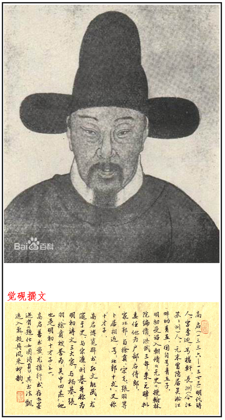 高启(1336-1373),汉族,元末明初著名诗人,文学家。字季迪,号槎轩,长洲(今江苏苏州市)人。元末隐居吴淞青丘,自号青丘子。高启才华高逸,学问渊博,能文,尤精于诗,与刘基、宋濂并称“明初诗文三大家”,又与杨基、张羽、徐贲被誉为“吴中四杰”,当时论者把他们比作“初唐四杰”。又与王行等号“北郭十友”。