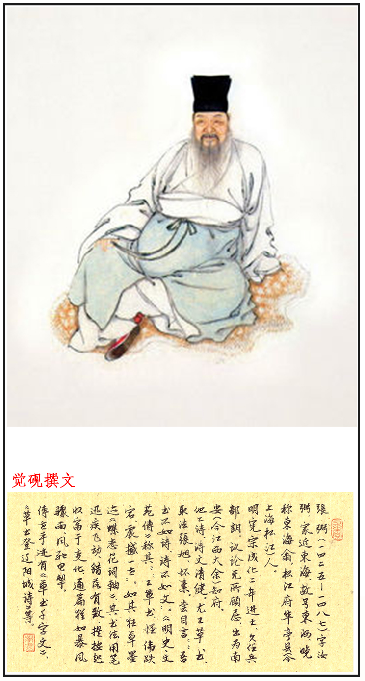 张弼(1425~1487)字汝弼,家近东海,故号东海,晚称东海翁。松江府华亭县(今上海松江)人。明宪宗成化二年进士,久任兵部郎,议论无所顾忌,出为南安(今江西大余)知府,律己爱物,大得民和。长于诗文,草书甚佳,被评为“颠张复出”。尝自言吾书不如诗,诗不如文,著有《东海集》。