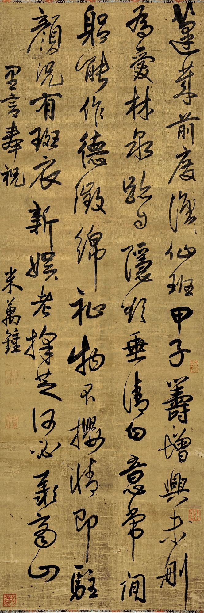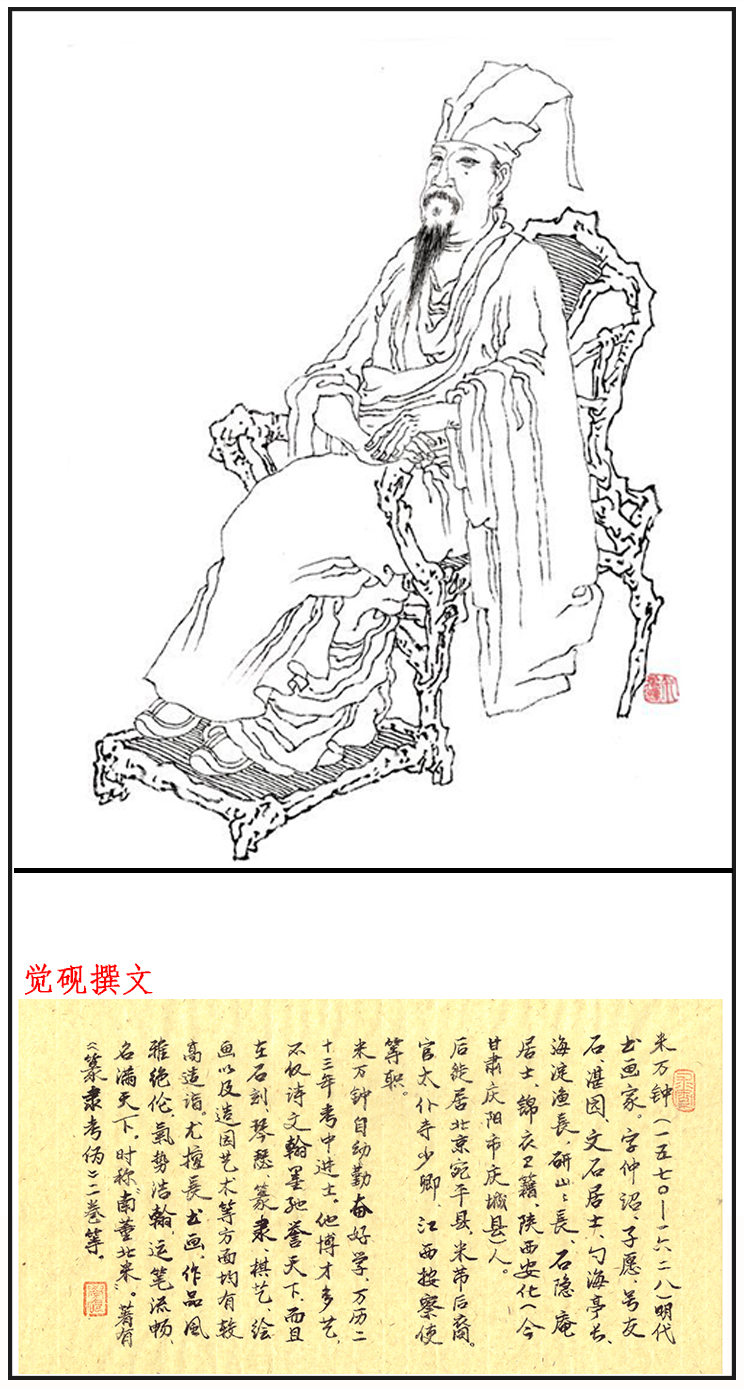 米万钟有好石之癖,善山水,花竹,书法行、草俱佳,既有南宫篆法,也有章草遗迹,与董其昌齐名,称“南董北米”,与董其昌、邢侗、张瑞图并称“明末书法四大家”。 [1]