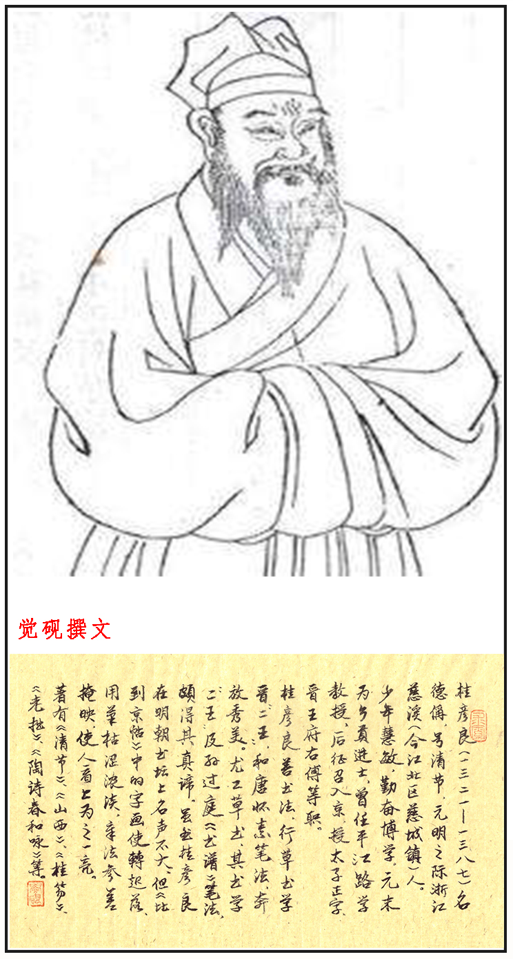 桂彦良(1321-1387),名德偁,号清节,元明之际浙江慈溪(今江北区慈城镇)人。少年慧敏,勤奋博学。元末为乡贡进士,曾任平江路学教授,观世不可为,遂东归,放情山水间,肆为诗古文。张士诚、方国珍争相聘请,均不就。洪武六年(1373)应征召入京,授太子正字,在文华堂为太子以下多位青年官员讲学,以孔孟圣学为本,汇聚历代治政之精华,联系明代国情之实际,解当务之急。两年后,学生中有七八人擢为行省参政,八人为按察检事,十九人出任知府,其余皆授御史。朱元璋也时有咨询,彦良所对,帝每称善,书其语揭便殿,曾呼“老桂”而不名。