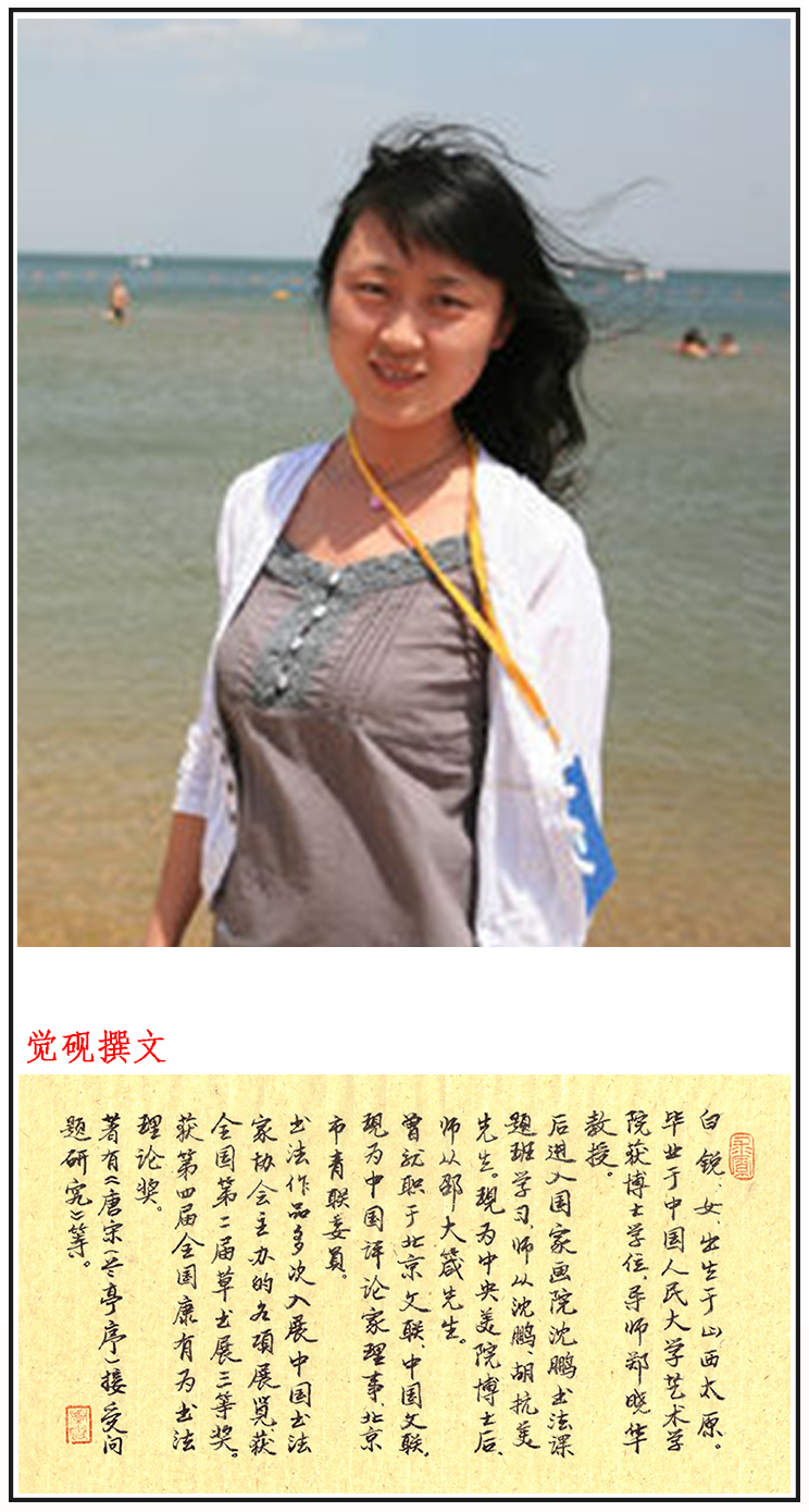 白锐,女,文学硕士、美学博士、艺术学理论博士后 、副研究员。博士毕业于中国人民大学艺术学院,导师郑晓华教授。毕业后进入国家画院沈鹏书法课题班学习,师从沈鹏先生和胡抗美先生。现为中央美院博士后,师从邵大箴先生。中国文艺评论家协会理事、中国书法家协会女书家委员会委员、北京书法家协会理事、中国国家画院沈鹏书法创研班助教、北京市青联委员。