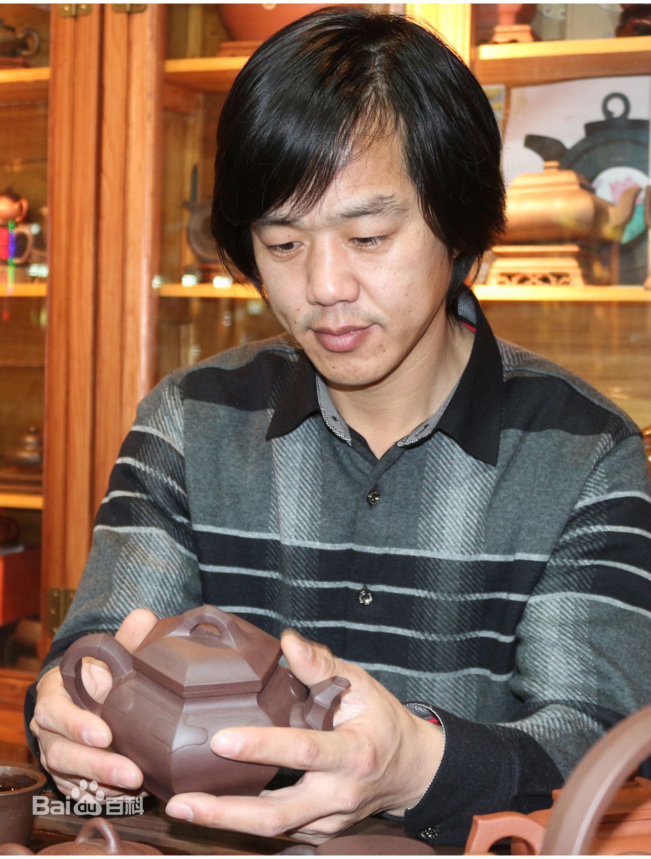 耿春福:1972年出生于江苏宜兴丁蜀紫砂世家,江苏省工艺美术大师,中国高级工艺美术师,中国工艺美术学会会员,1990年进紫砂工艺厂,1993年获中国工艺美术学会授予“中国紫砂优秀中青年陶艺家”,1995年到“宜兴紫砂工艺美术学院造型设计系”学习,2003年创办紫砂工作室,命名为:春福壶坊。善于总结前人经验,传承创新,紫砂制作稳妥扎实,在其多年的创作实验中,慢慢形成自己独立的制壶风格。并能与各类艺术大家相融相通,并大胆的结合紫砂特质进行构思创作。设计古朴独特,深入研究有关紫砂艺术研究的论文,理论功底扎实,有独到见解,其作品多次出口日本、新加坡、马来西亚、香港、台湾、挪威等国家和地区,并得到当地各界人士的喜爱,擅长的壶形有提梁壶、六方壶等,具有线条流畅、刻划细腻、古朴典雅,并在前人的思路上修改《古如意》,创新为《四季如意》,具有纹路深刻,壶样大气,砂质纯正等特点。