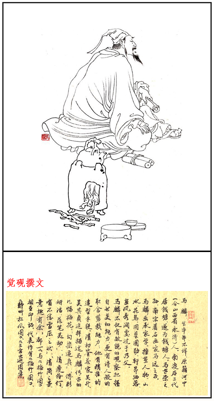 马麟,生卒年不详,原籍河中(今山西省永济),南渡后三代居钱塘,遂为钱塘人。马世荣之孙,南宋著名画家马远之子。马远是宋光宗、宋宁宗两朝画院待诏,马麟画承家学,擅画人物、山水、花鸟,用笔圆劲,轩昂洒落,画风秀润处过于乃父。宁宗嘉泰间授画院祗候,颇得宁宗赵扩、恭圣皇后杨氏及杨妹子称赏,每于父子画上题句。在《层叠冰绡图》中题诗云:“浑如冷蝶宿花房,拥抱檀心忆旧香。开到寒梢尤可爱,此般必是汉宫妆。”《画史会要》谓:“麟不逮父。远爱其子,多于己画上题麟,盖欲其章也。”