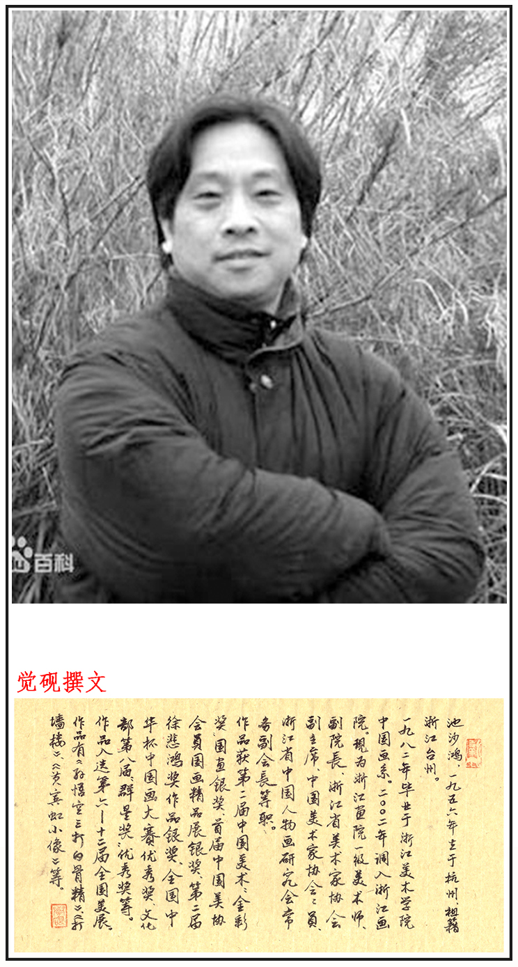 池沙鸿 ,1956年生于杭州,祖籍浙江台州。1982年2月毕业于浙江美术学院中国画系。毕业分配至浙江省文化厅群众文化处任干事。1984年调入浙江省群众艺术馆任美术摄影室主任、副馆长,研究馆员。2002年调入浙江画院。现为浙江画院一级美术师、副院长、浙江省美术家协会副主席、中国美术家协会会员、浙江省文学艺术界联合会委员、浙江省中国人物画研究会常务副会长,获国务院颁发的政府特殊津贴。
