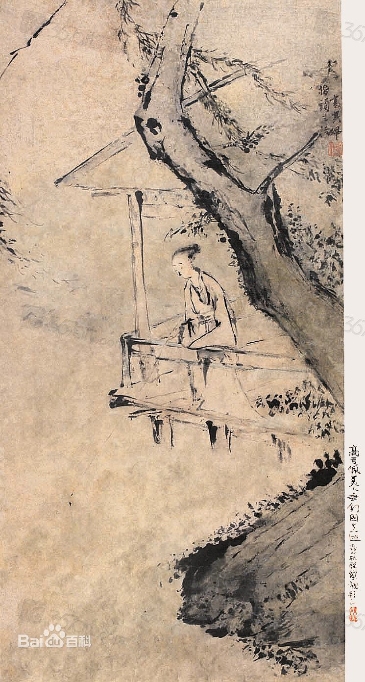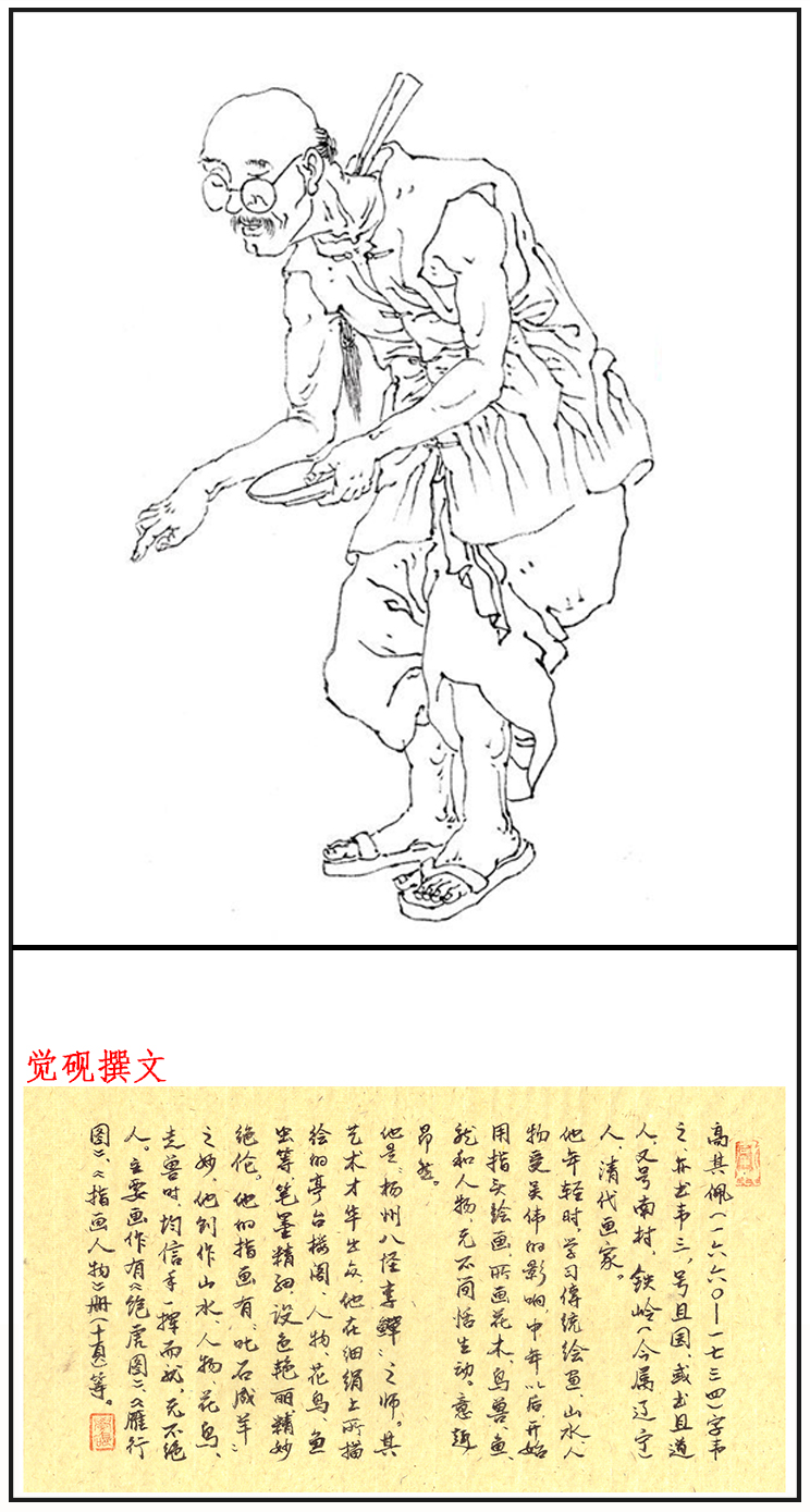 高其佩(1660年—1734年,一作1672年—1734年),字韦之,号且园、南村、书且道人,别号颇多,另有山海关外人、创匠等。奉天辽阳(今属辽宁)人,隶籍汉军。清代官员、画家,指画的开山祖师。康熙时以荫由宿州知州迁四川按察使,雍正间擢都统,后罢去。工诗善画,所绘人物山水,均苍浑沉厚,尤善指画,晚年遂不再用笔。