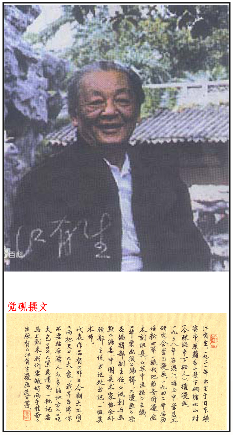 江有生(1921年12月14日年—2015年5月6日),漫画家,原名江文著,出生于日本横滨市,原籍香山县下栅墟北山村(今珠海市下栅)。2015年5月6日,江有生因病去世,享年94岁。1938年在澳门培正中学美术研究会学习漫画。1942年后历任新四军一旅战地服务团漫画木刻组长,《苏中画报》主编,《华东画报》编辑,《漫画》杂志编辑部副主任,《讽刺与幽默》编委,中国美术家协会外联部主任、书记处书记。一级美术师。