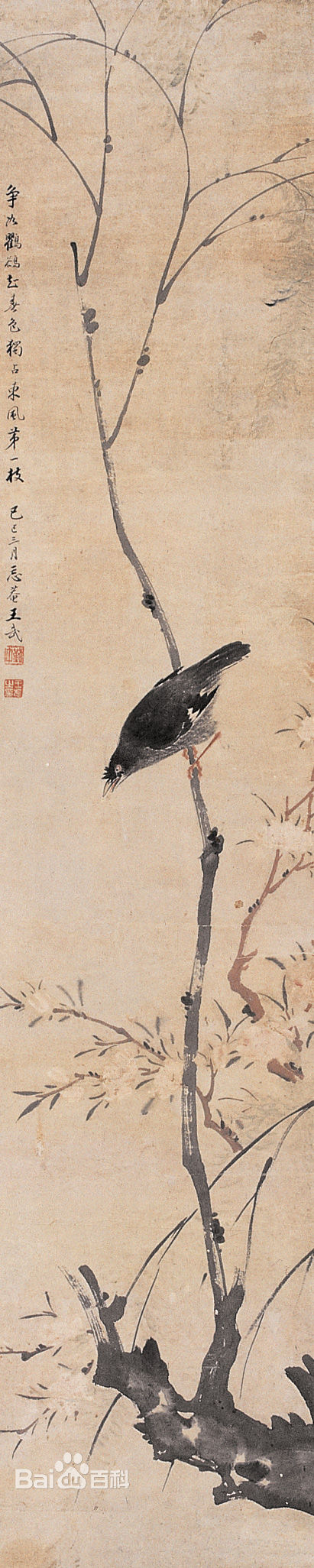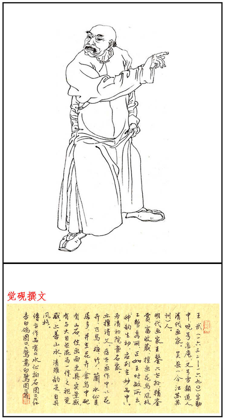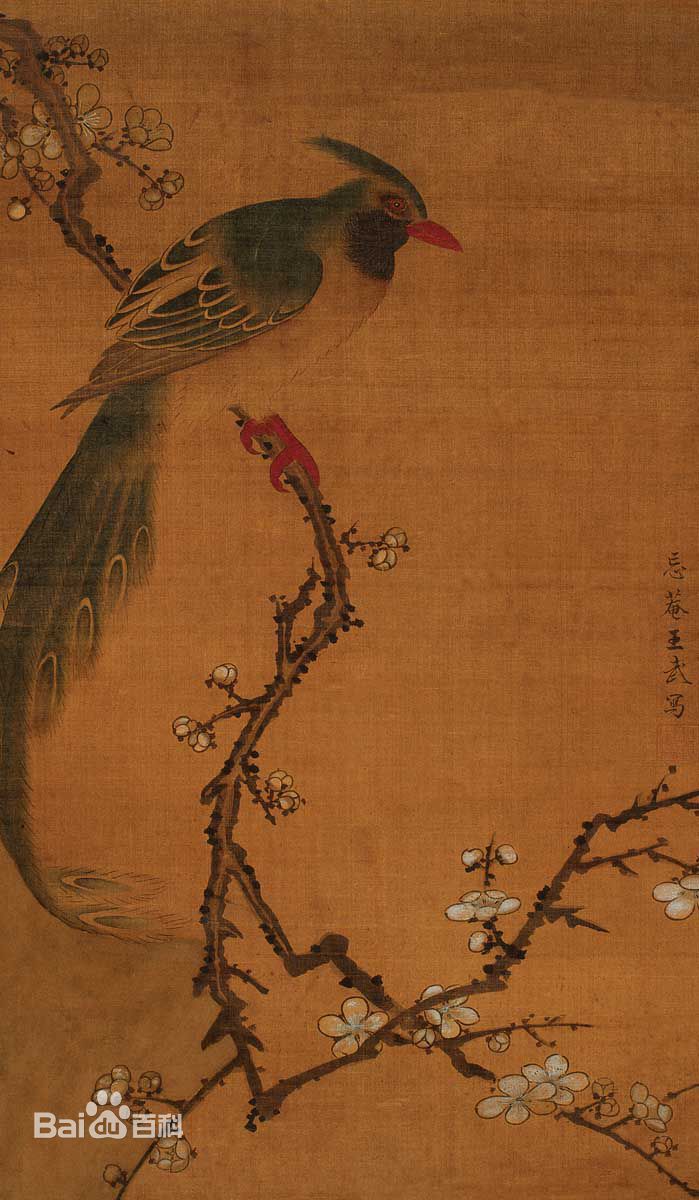 王武,1632年生,1690年逝世,吴县(今江苏苏州)人。字勤中,晚号忘庵,又号雪颠道人。明代画家王鏊六世孙,精鉴赏,富收藏,擅画花鸟,风格工整秀丽,正如王时敏所云:“神韵生动,应在妙品中。”为清初院画的名家。亦擅诗文。传世作品有《水仙柏石图》、《红杏白鸽图》、《鸳鸯白鹭图》等。