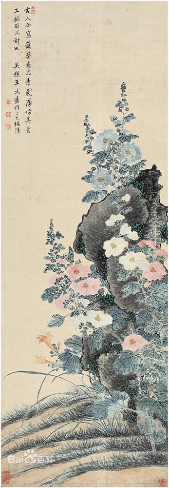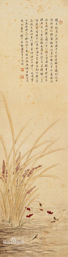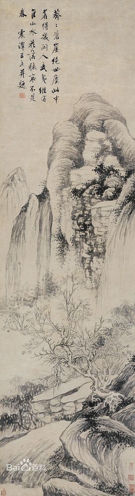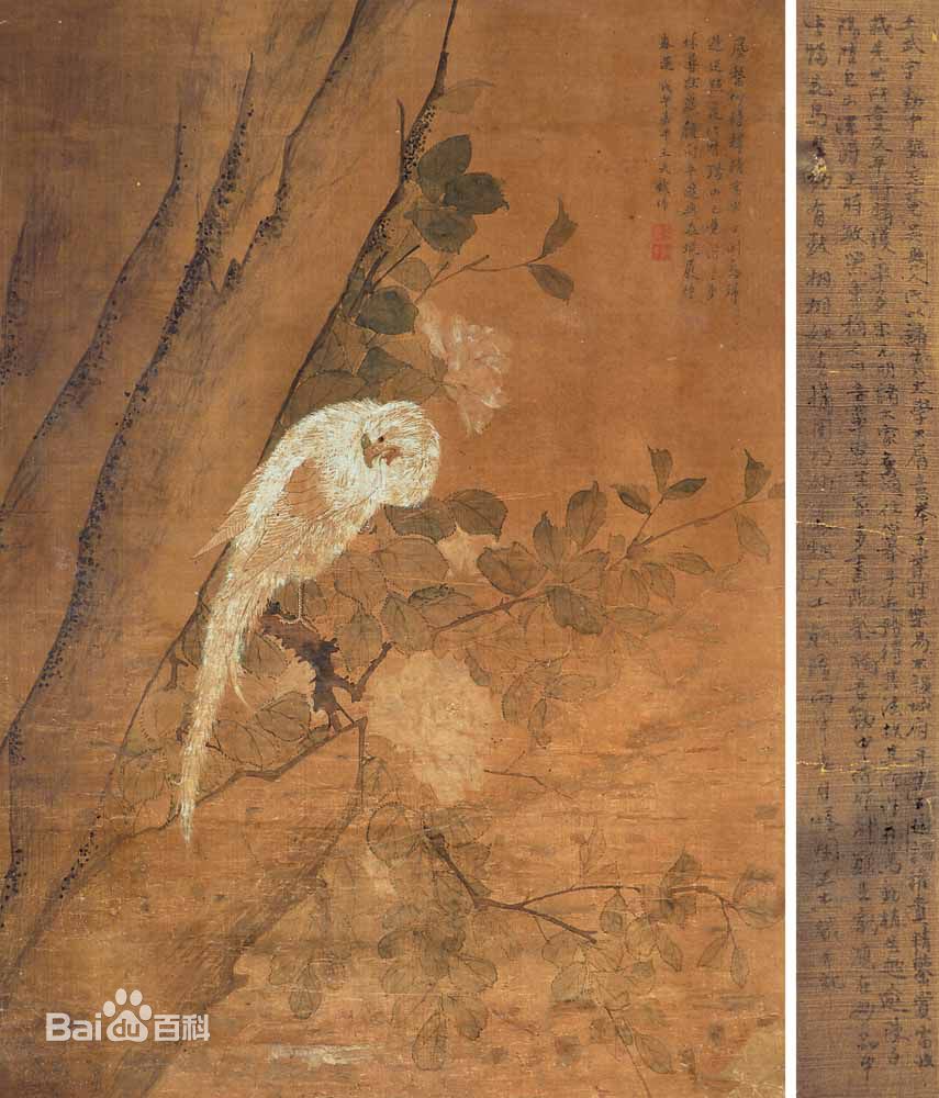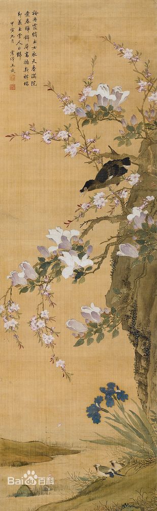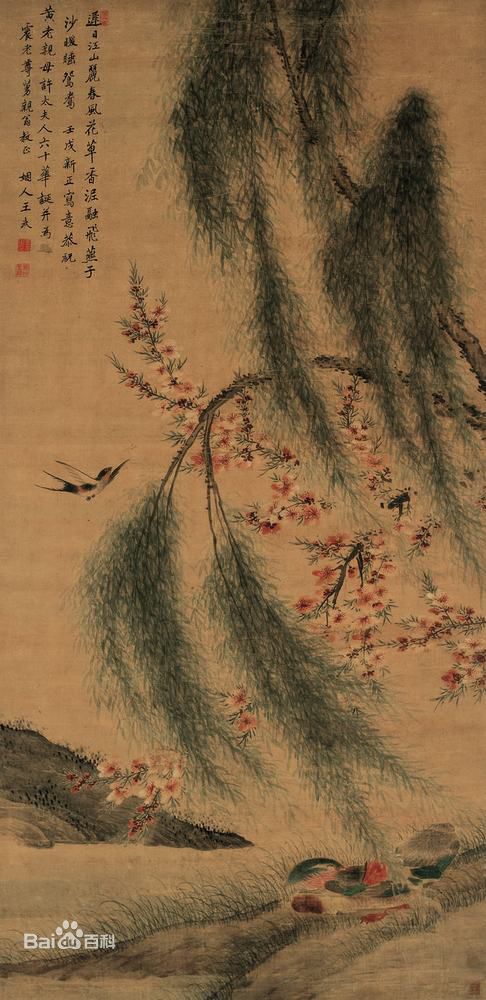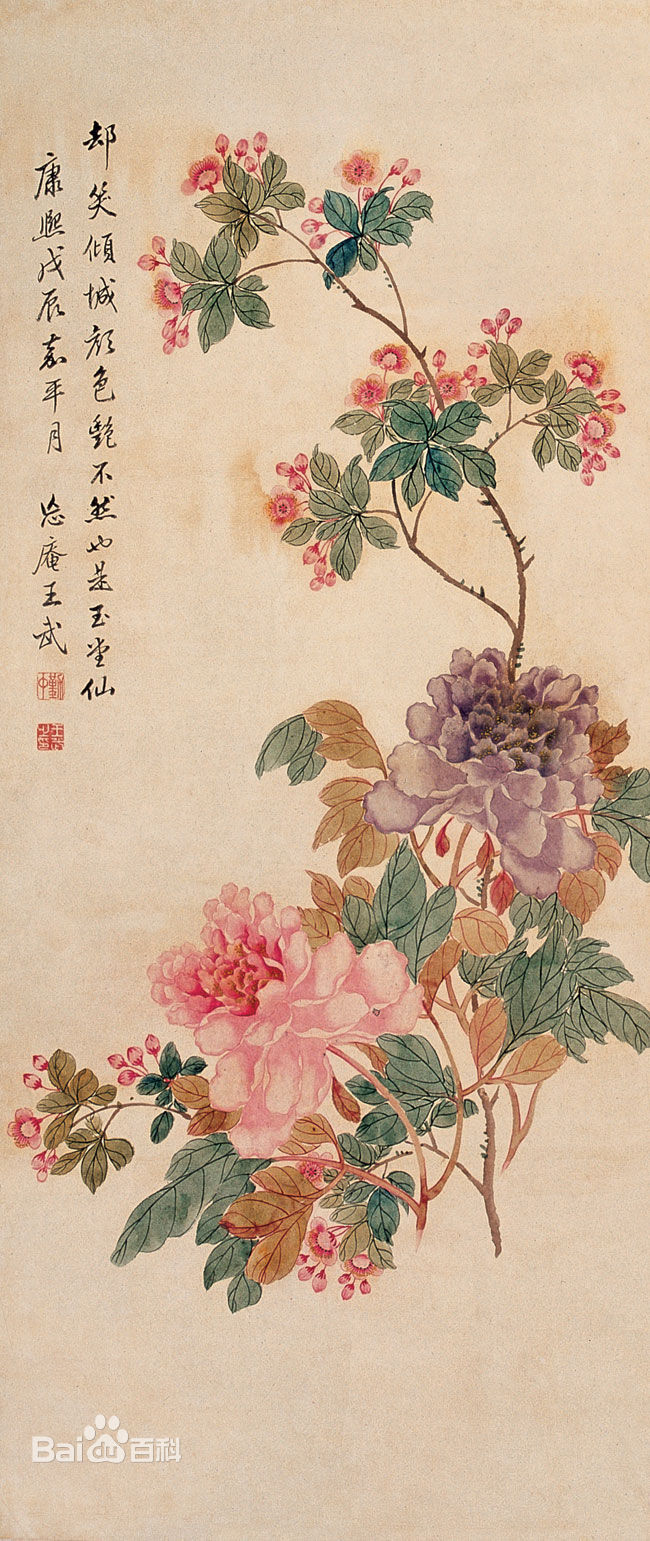 王武,1632年生,1690年逝世,吴县(今江苏苏州)人。字勤中,晚号忘庵,又号雪颠道人。明代画家王鏊六世孙,精鉴赏,富收藏,擅画花鸟,风格工整秀丽,正如王时敏所云:“神韵生动,应在妙品中。”为清初院画的名家。亦擅诗文。传世作品有《水仙柏石图》、《红杏白鸽图》、《鸳鸯白鹭图》等。
