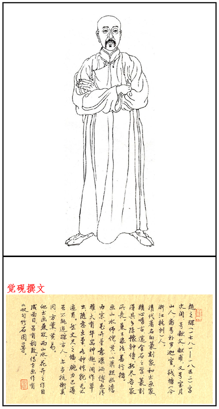 赵之琛(1781-1852),钱塘(今浙江杭州)人。字次闲,号献父、献甫,又号宝月山人,斋号补罗迦室。蝶隐园书画杂缀作赵之瑛。清代著名的篆刻家和书画家,精心嗜古,邃金石之学,篆刻得其乡陈豫锺传,能尽各家所长。尝为阮元摹刊钟鼎款识,兼工隶法,善行楷。画山水师倪、黄,以萧疏幽澹为宗。花卉笔意潇洒,傅色清雅,大有华嵓神趣。间作草虫,随意点笔,各种体貌,无不逼肖。然丈尺之幅,腕力已薄,虽不能追踪古人,亦当抗衡奚冈、方薰、黄易。