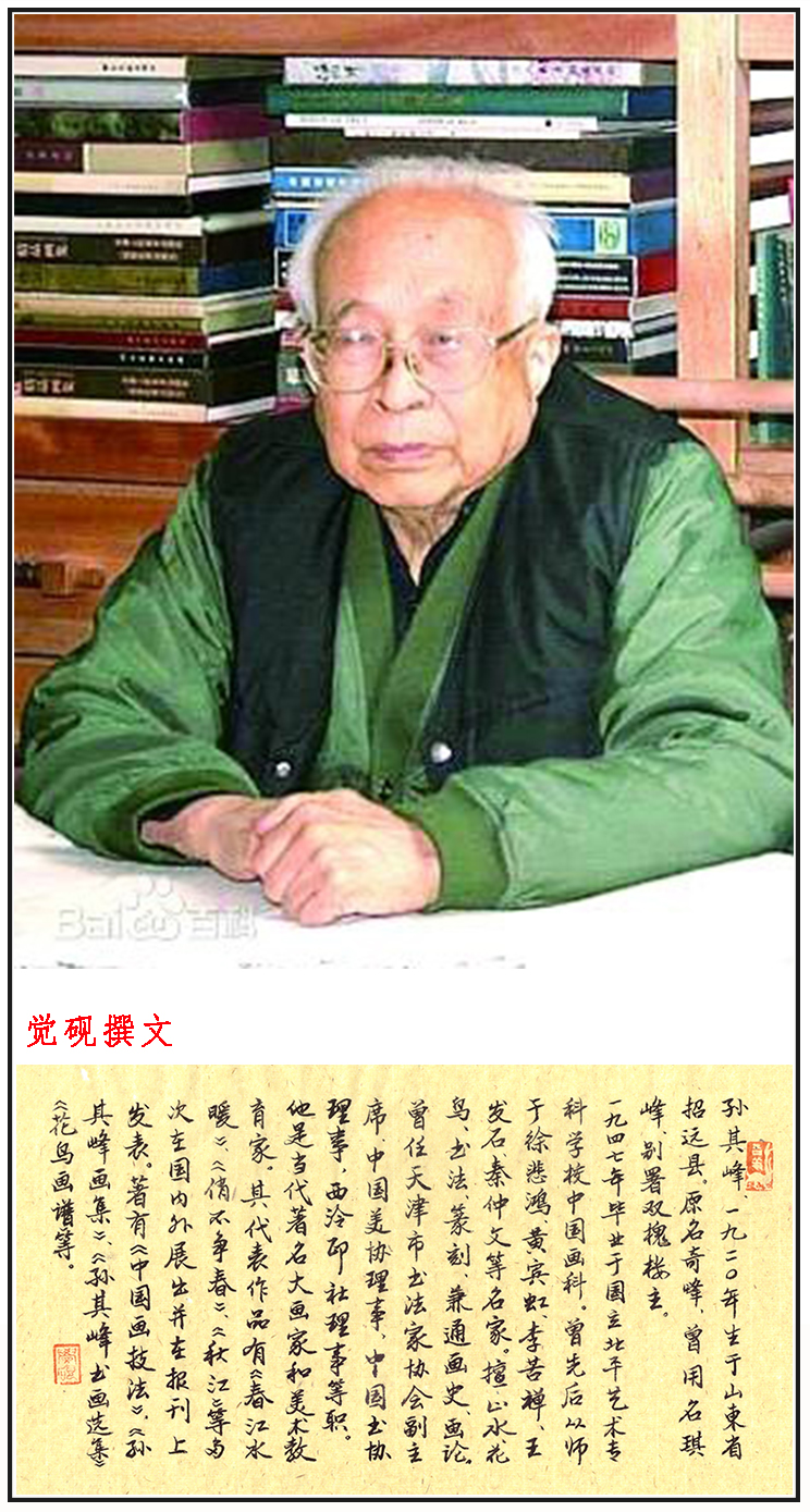 孙其峰,男,汉族,1920年生,山东招远人,国立北平艺专毕业。天津美术学院终身教授,文化部中国画研究院院部委员,中国美术家协会理事,中国书法家协会理事,西泠印社理事,享受国务院特殊贡献津贴专家,天津当代美术教育(高等美术教育和社会美术教育)的重要奠基人。曾任天津美术学院副院长。代表作《春江水暖》《俏不争春》《秋江》等多次在国内外展出并在报刊上发表。著有《中国画技法(第一辑)》《孙其峰画集》《孙其峰书画选集》《花鸟画谱》《孙其峰教学手稿》等。2013年1月29日,获第二届“中国美术奖·终身成就奖”。