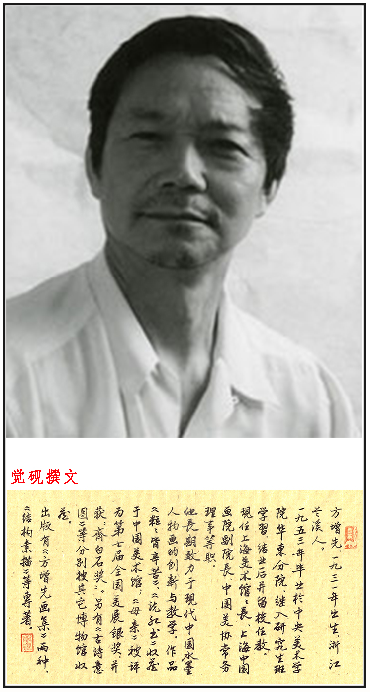 方增先,男,汉族,1931年生,浙江兰溪现代画家,20世纪后半叶现实主义中国人物画创作的代表人物之一,中国画坛具有影响力的“新浙派人物画”的奠基人与推动者。浙江杭州国立艺术专科学校毕业。曾任第五届全国人大代表、上海美术馆馆长、中国美术学院荣誉教授、上海市美术家协会主席、中国国家画院中国画院院长。出版画集《方增先人物画》《方增先水墨画诗意画》《方增先古装人物画集》《方增先人物画四十年》等,专著有《怎样画水墨人物画》《结构素描》《人物画的造型问题》等。2013年1月获第二届“中国美术奖·终身成就奖”。