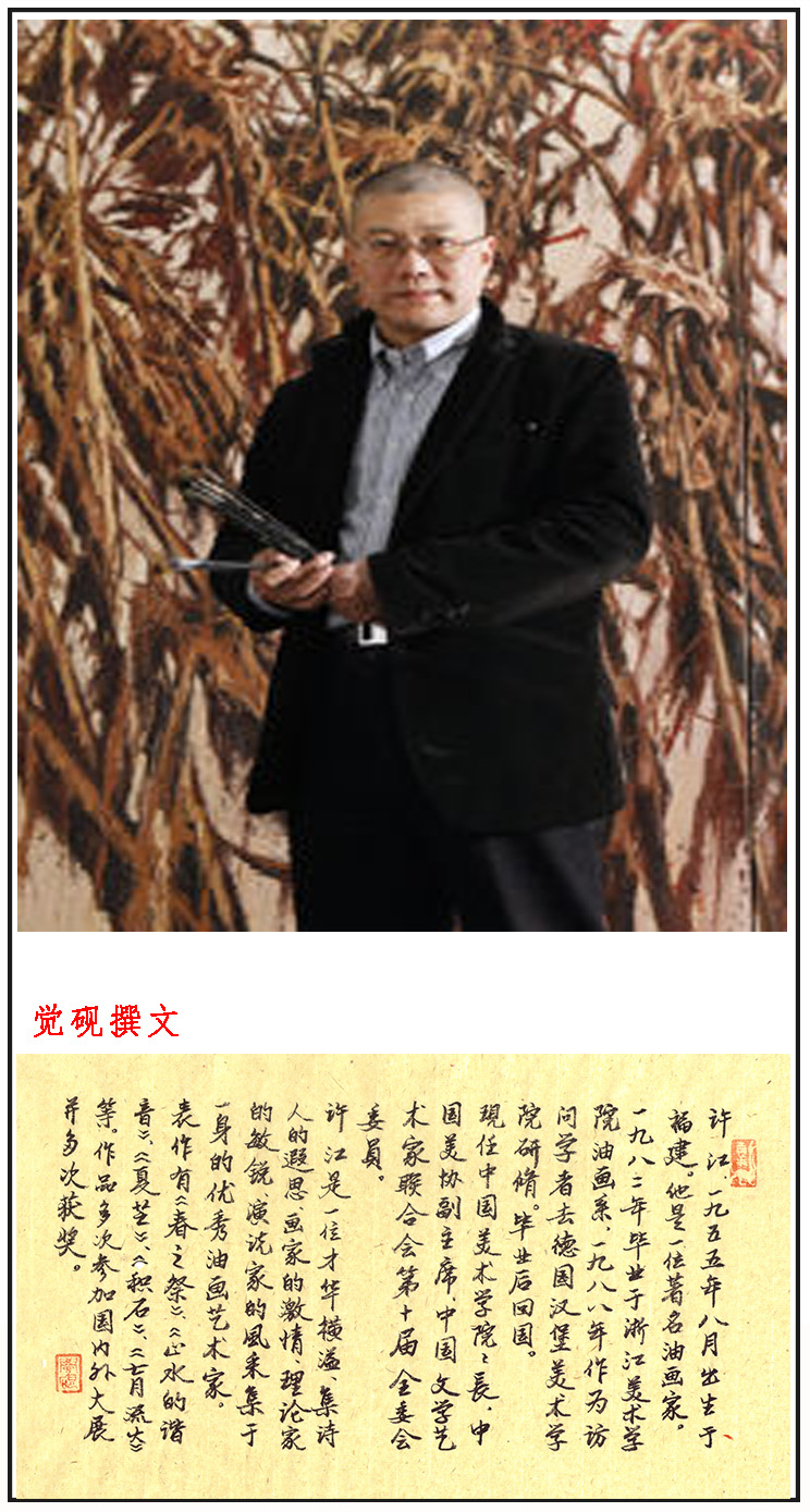 许江,1955年8月出生于福建。1982年毕业于浙江美术学院油画系,1988年作为访问学者去德国汉堡美术学院研修。现任中国美术学院院长、中国美术家协会副主席。中国文学艺术界联合会第十届全委会委员。