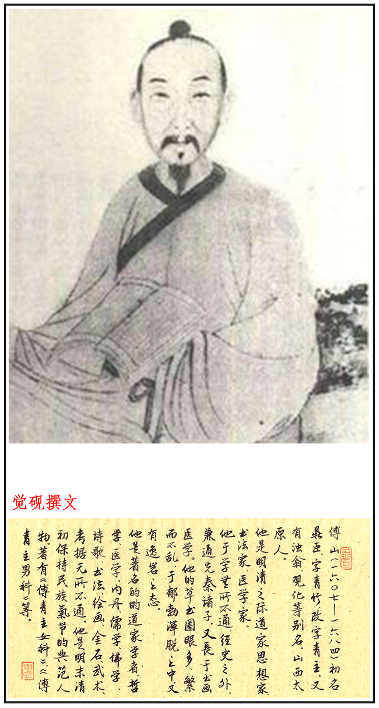 傅山于学无所不通,经史之外,兼通先秦诸子,又长于书画医学。北京大学教授、引碑入草开创者的李志敏评价:“傅山的草书圈眼多,繁而不乱,于郁勃浑脱之中,又有逸岩之态”。 [4] 著有《霜红龛集》等。一些武侠小说里,傅山被描写为武侠高手。他是著名的道家学者,哲学、医学、内丹、儒学、佛学、诗歌、书法、绘画、金石、武术、考据等无所不通。他被认为是明末清初保持民族气节的典范人物。傅青主与顾炎武、黄宗羲、王夫之、李颙、颜元一起被梁启超称为“清初六大师”。著有《傅青主女科》《傅青主男科》等传世之作,在当时有“医圣”之名。《清史稿》卷五百一有传。 [5]