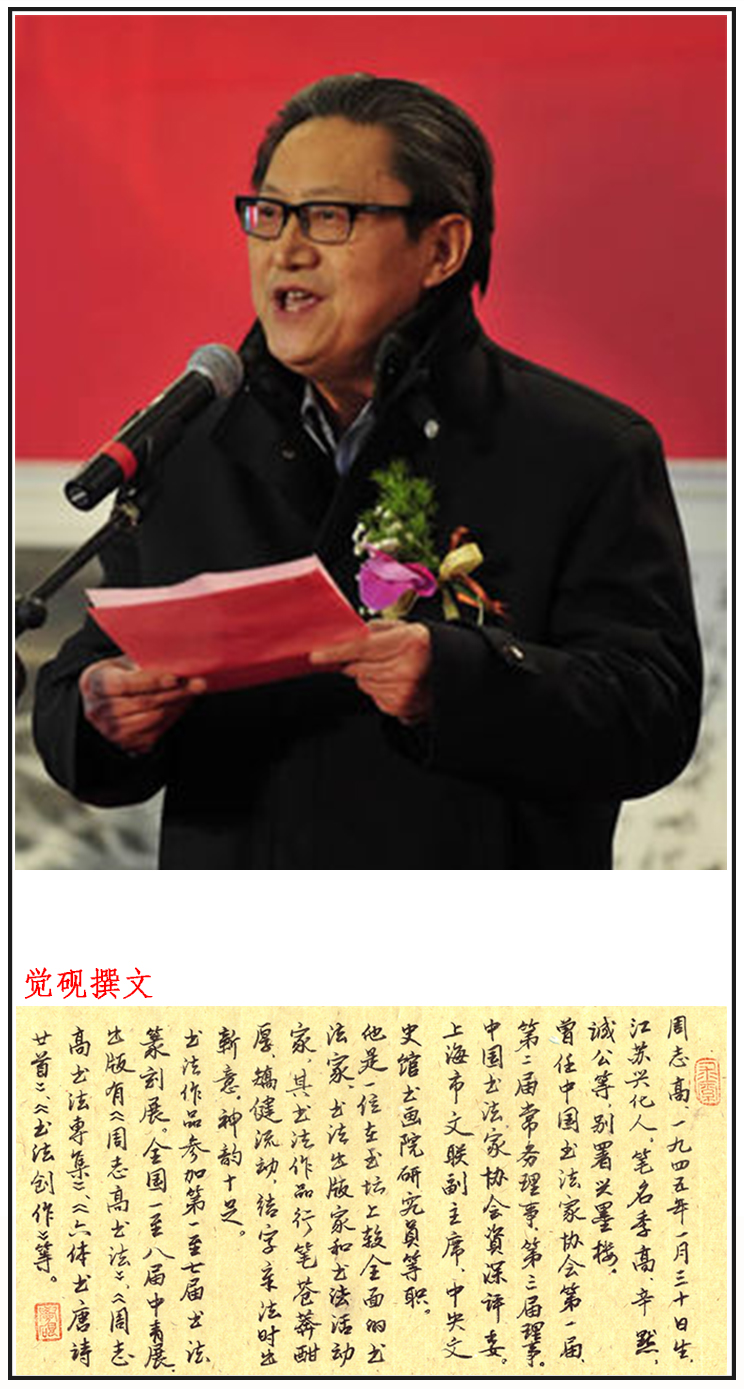周志高,笔名季高、辛默、诚公等,别署兴墨楼,1945年1月30日生,江苏兴化人。中国书法家协会第一届、第二届常务理事,第三届理事,中国书法家协会资深评委,全国展、全国中青展评审委员,中国书协培训中心特聘教授等。先后荣获首届华东六省一市优秀期刊评比一等奖、中国书协首届报刊编辑出版“兰亭奖”。先后主持或参与主办全国首届群众书法竞赛、全国第一届书法篆刻展览、全国首届书学研讨会、全国首届篆刻征稿评比和全国中青年“书苑撷英”大赛。多次应邀出访日本、新加坡、韩国和香港等国家和地区举办个人书展和讲学。