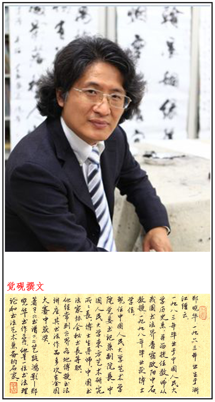 郑晓华,1963年出生于浙江缙云。1983年毕业于中国人民大学历史系,毕业后留校任教。1995年考入首都师范大学书法研究所,师从书坛耆宿欧阳中石教授,攻读书学博士学位。1998年毕业获博士学位,为我国首届书法专业博士学位获得者。现任中国书法家协会分党组副书记秘书长。自幼爱好书法,研究临池30余年,兼善各体,尤精意于行书和隶书。行书从“二王”入手,兼取宋代米芾和明清之际的王铎,风格优雅俊逸。隶书以“汉碑”为基础,吸收汉简和楚简的笔法,融入大小篆字形,略参行草笔意,形成古朴雄健的风格,在当代中国书坛自成一家。