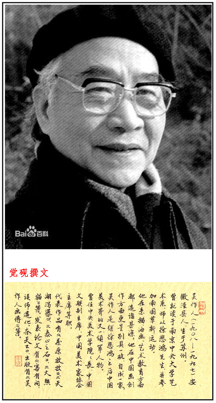 吴作人(1908年11月3日-1997年4月9日),男,安徽宣城泾县人,生于江苏苏州,1926年入苏州工业专科学校建筑系,1927年至1930年初先后就读于上海艺术大学、南国艺术学院美术系及南京中央大学艺术系,从师徐悲鸿先生,并参加南国革新运动。早年攻素描、油画,晚年后专攻国画,境界开阔,寓意深远,以凝练而准确的形象融会着中西艺术,是继徐悲鸿之后中国美术界的又一领军人物。