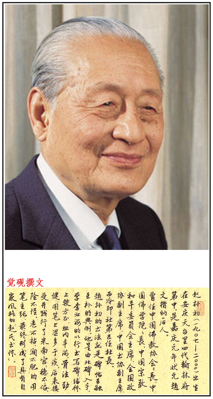 赵朴初(1907年11月5日-2000年5月21日),安徽安庆人,中国民主促进会创始人之一,卓越的佛教领袖、杰出的书法家、著名的社会活动家与伟大的爱国主义者。