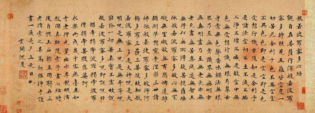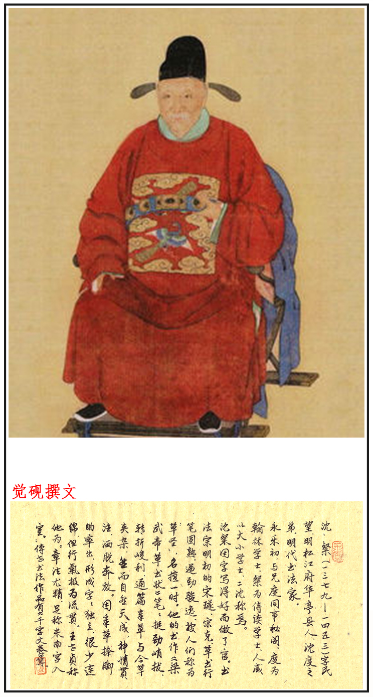 沈粲(1379~1453),字民望,明松江府华亭县人,沈度之弟。善真、草书,飘逸遒劲,自成一家。尤长于诗,有集二千余首。永乐初,与兄度同事秘阁,度为翰林学士,粲为侍读学士,人咸以大小学士、二沈称焉。历成、仁、宣、英四朝,俱受殊宠。自兄殁[mò]后,凡玉册金简,国家大制作,皆出粲笔。累迁大理寺少卿,与兄子藻同致仕归。性孝友,伯仲同居,笃于事兄,人以为莫及。尤端厚谦抑,好奖掖后进。襟怀爽闿,不屑屑细,故自号简庵。有《草书千字文卷》《草书古诗轴》《梁武帝草书状卷》《重建华亭县治记》等传世。著《简庵诗稿》。