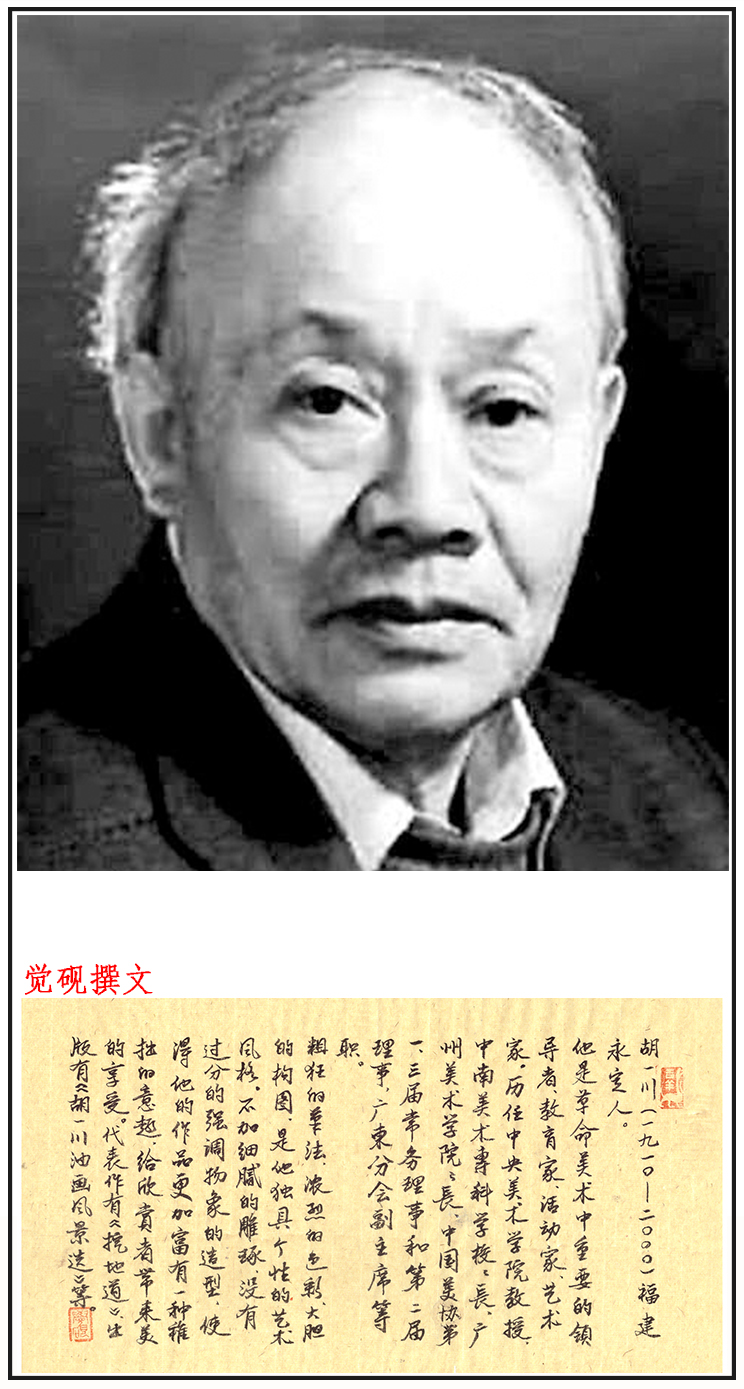 胡一川,油画家、版画家,福建永定人。原名胡以撰,后改今名,曾化名胡白夫。1929年入杭州国立艺专,参加一八艺社和美联,并加入共青团。1933年转入共产党。1936年在厦门《星光日报》及厦门美专任记者和教员。抗战后到延安,任鲁艺木刻工作团团长。1939年创办木刻工厂,大量印刷套色年画、抗日宣传画。解放后任中央美术学院教授,中南美专、广州美术学院院长,中国美协常务理事,广东美协副主席、省文联常委、省人大常委等职。作品先后有木刻《饥民》、《失业工人》、《到前线去》,油画《开镣》、《红军长征走过的偏桥》等,曾在《美术学报》上发表文章《回忆鲁迅与一八艺社》。