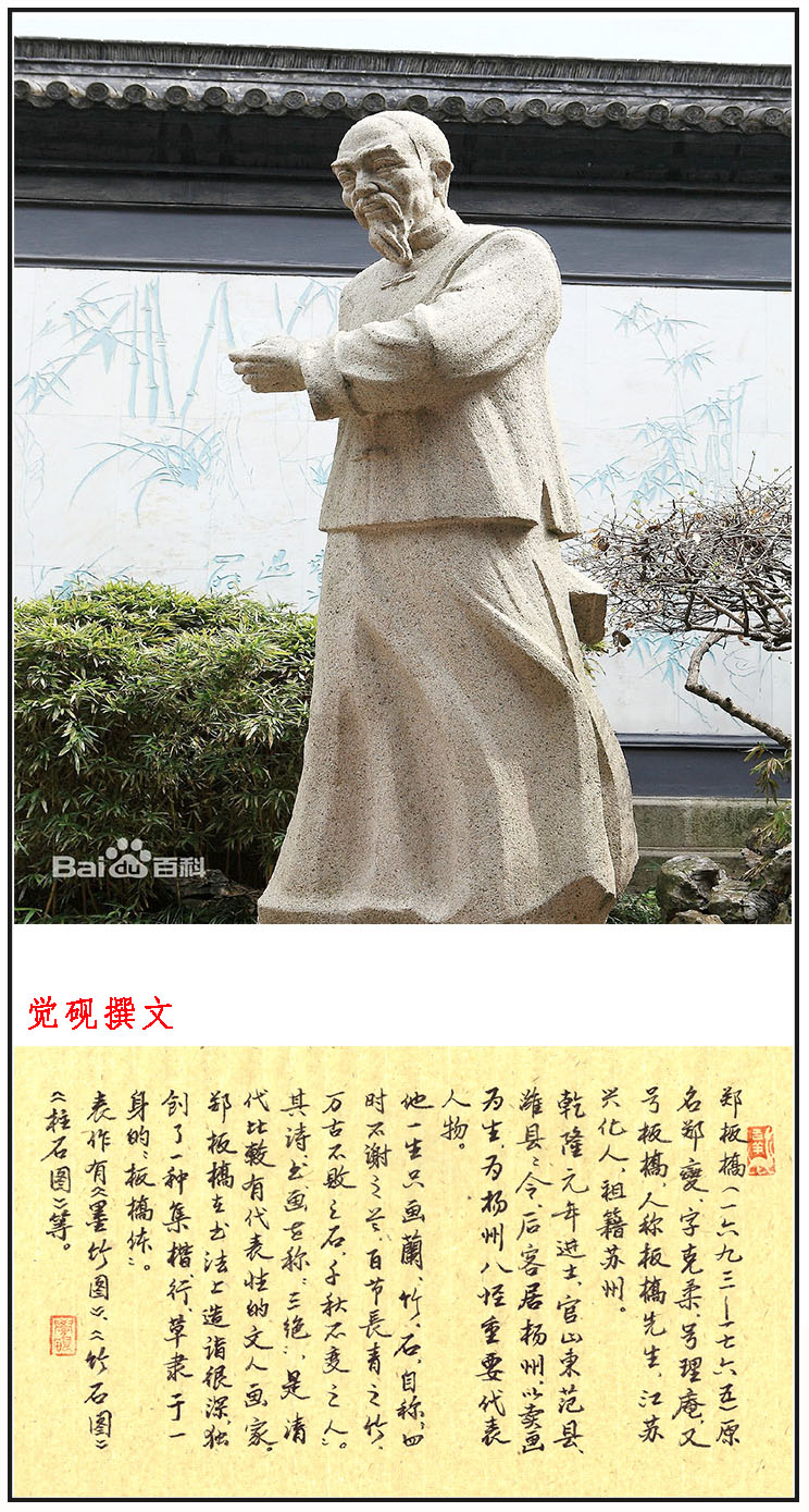 郑板桥(1693-1765),原名郑燮,字克柔,号理庵,又号板桥,人称板桥先生,江苏兴化人,祖籍苏州。康熙秀才,雍正十年举人,乾隆元年(1736年)进士。官山东范县、潍县县令,政绩显著,后客居扬州,以卖画为生,为“扬州八怪”重要代表人物。
