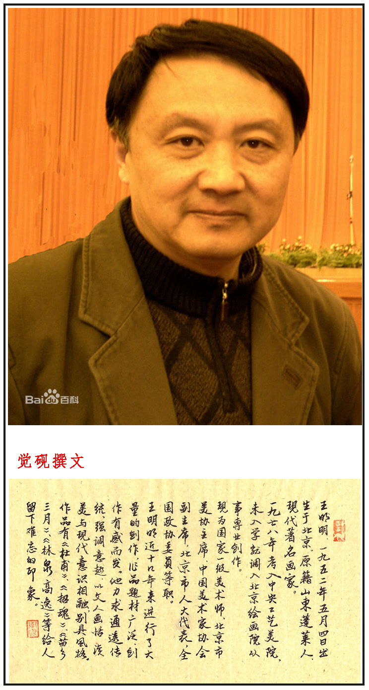 王明明,国务院参事室原副主任,1952年5月4日生于北京,山东蓬莱人。 自幼酷爱绘画,儿童时代的作品曾到三十几个国家展出,曾获世界儿童画比赛特等奖、一等奖。1978年考入中央工艺美院未入学,同年调入北京绘画院从事专业创作。 中国文学艺术界联合会第十届全委会委员。 [1]