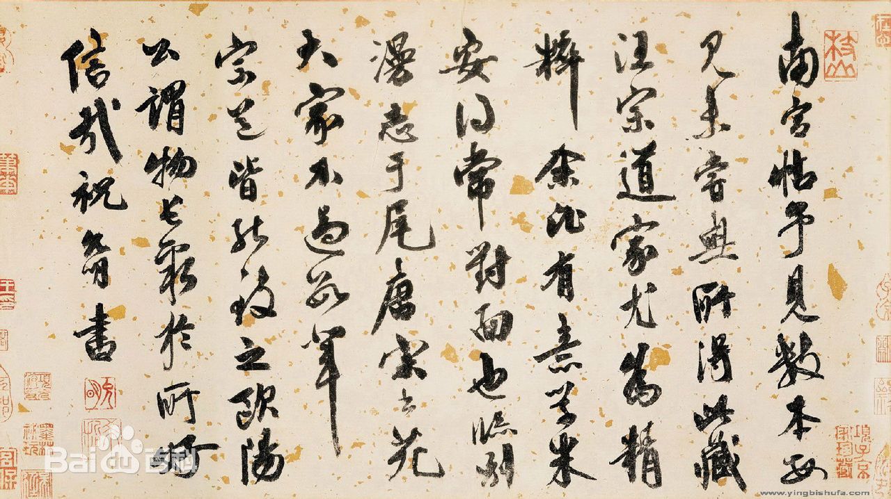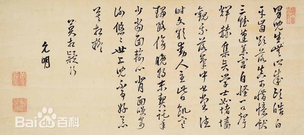 祝允明擅诗文,尤工书法,名动海内。他与唐寅、文徵明、徐祯卿并称“吴中四才子”。又与文徵明、王宠同为明中期书家之代表。楷书早年精谨,师法赵孟頫、褚遂良,并从欧、虞而直追“二王”。草书师法李邕、黄庭坚、米芾,功力深厚,晚年尤重变化,风骨烂熳。北京大学教授、引碑入草开创者的李志敏评价:“祝枝山的狂草,骨力弱于旭、素,但在宋人影响下,又自成一格”。 [1] 其代表作有《太湖诗卷》《箜篌引》《赤壁赋》等。所书“六体书诗赋卷”“草书杜甫诗卷”“古诗十九首”“草书唐人诗卷”及“草书诗翰卷”等皆为传世墨宝。