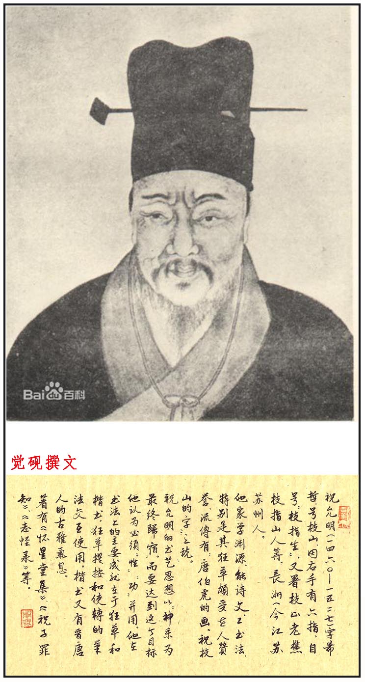 祝允明(1461年1月17日-1527年1月28日)生于天顺四年十二月六日,卒于嘉靖五年十二月二十七日,字希哲,长洲(今江苏吴县)人,因长像奇特,而自嘲丑陋,又因右手有枝生手指,故自号枝山,世人称为“祝京兆”,明代著名书法家。