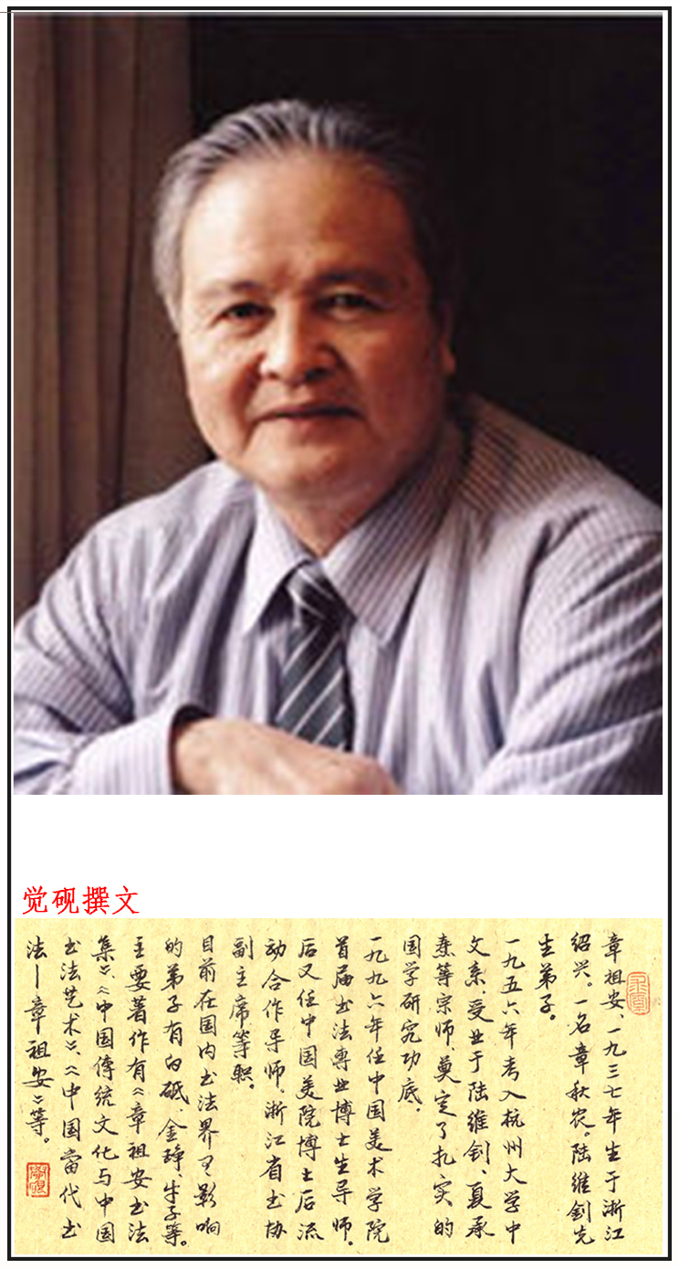 章祖安,一名章秋农,陆维钊先生弟子,中国美术学院书法系教授、博士生导师。1937年8月生于浙江绍兴,自幼习武,并受家塾的传统教育,熟习四书五经及《左传》、《史记》。1956年考入杭州大学中文系,受业于陆维钊、夏承焘、王焕镳、胡士莹、姜亮夫、任铭善、蒋礼鸿、徐朔方等宗师,尤与陆维钊、王焕镳、姜亮夫、夏承焘诸先生亲善,耳提面命,教诲独多,奠定了扎实全面的国学研究功底。1961年,由陆维钊先生提名,调入浙江美院(今中国美术学院)中国画系,任陆先生助教,并由先生赐名佐韩(一作祖韩)。自该年始,开始陆续撰写学术论文,刊发于《中华文史论丛》、《中国语言》等刊物,研究范围涉及文、史、哲、艺术等各领域,尤于《易》学领悟精深,并曾受姜亮夫先生邀请,屡为杭州大学古籍研究所研究生班及“先秦古籍讲习班”主讲《周易》。1963年后,作为书法教研组成员之一,参与浙江美院中国画系历届书法本科及硕士研究生的专业教学工作。1996年,任中国美术学院首届书法专业博士生导师。翌年担任国务院学位委员会博士和硕士点通讯评议专家组成员,同年起任全国高等学校与科研院所学位与研究生教育通讯评议专家。2009年,任中国美院博士后流动站合作导师。先后担任杭州大学兼职教授,中国文化书院杭州分院导师,鲁迅美术学院特聘教授 [1] ,西南师范大学特聘教授、博导,浙江省书法家协会副主席,国务院特殊津贴专家。目前在国内书法界有影响的弟子有白砥、金琤、牛子等。